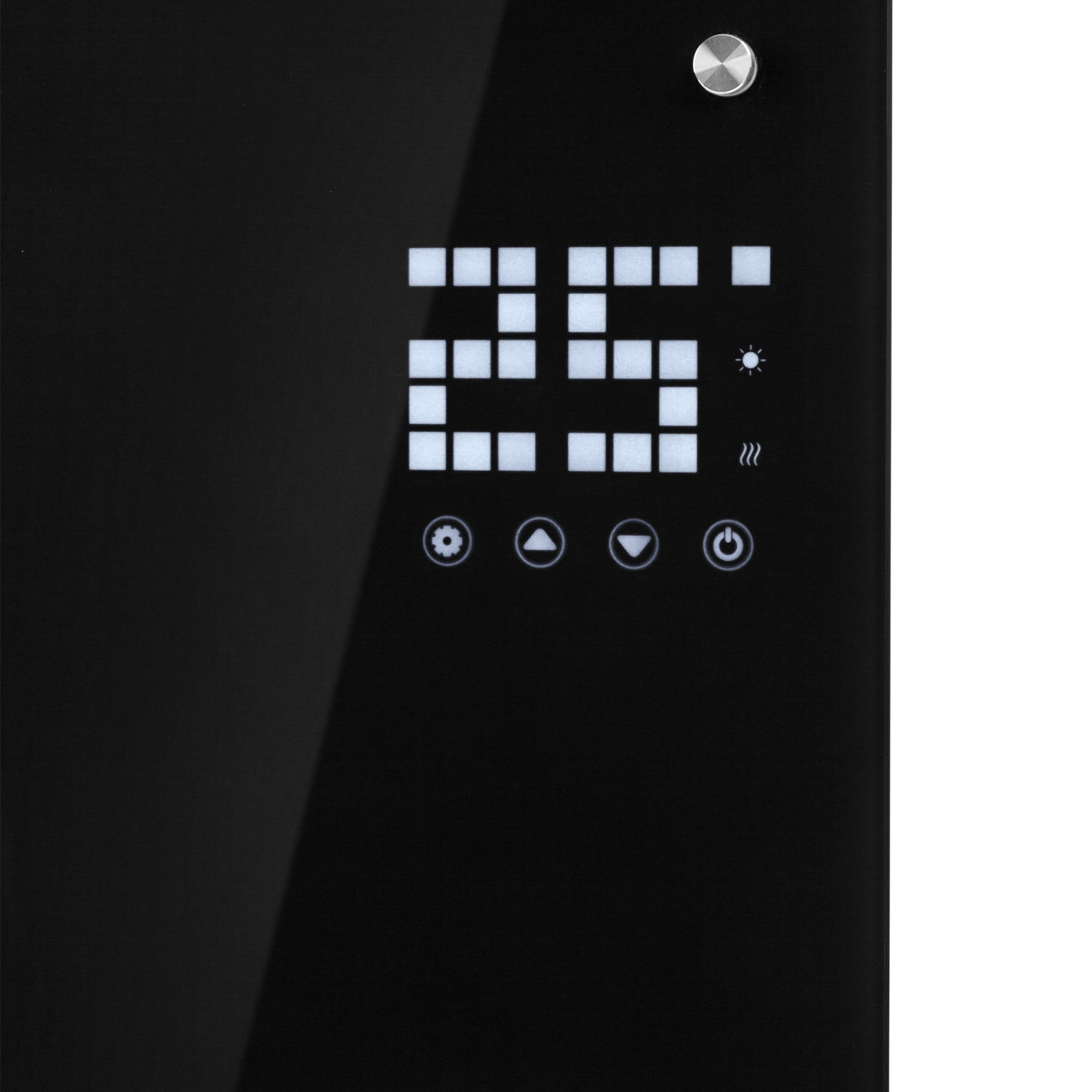 La pantalla led clara en la esquina superior derecha del panel frontal de cristal muestra la temperatura ambiente actual. Asimismo, la Klarstein App Experience proporciona el control total del aparato: permite controlar uno a varios aparatos de calefacción mediante el teléfono inteligente. También se puede operar el convector a través del panel de control táctil o el mando a distancia. ¡Gracias al práctico temporizador semanal uno no tendrá que cepillarse los dientes en el baño frío nunca más!
