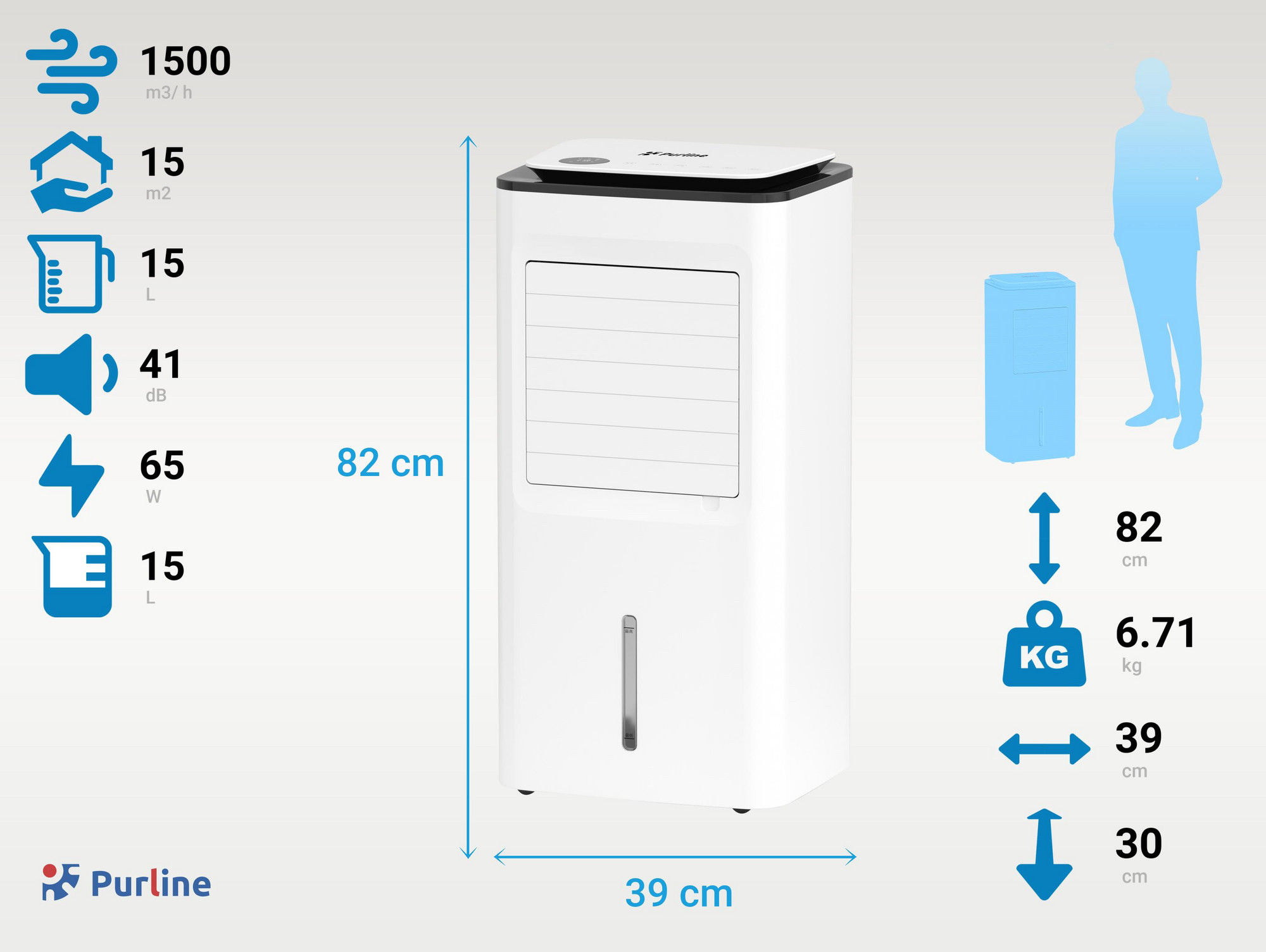 Con un diseño compacto acabado en blanco con detalles en negro, su tamaño (LxPxH: 39 x 30 x 82 cm) y su peso (8kg) lo hacen ideal para estancias de hasta 16m2, y gracias a sus ruedas lo podrás mover según tus propias necesidades.