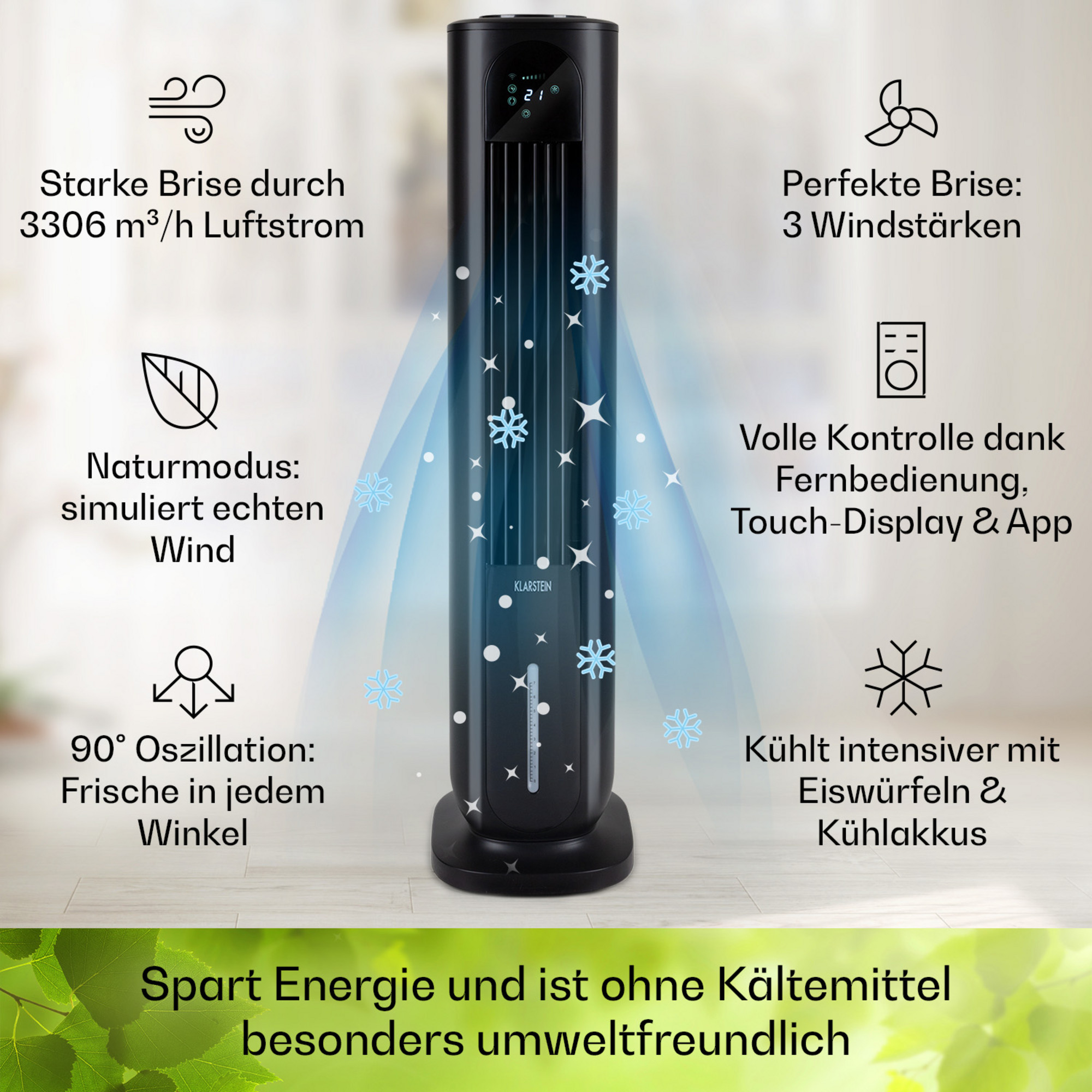 Especialmente inteligente cuando se trata de mantenerse fresco, gracias a la conexión WiFi, puedes dar órdenes al climatizador Polar Tower Smart de Klarstein fácilmente a través de la aplicación en tu smartphone o iPhone, desde cualquier lugar. Por supuesto, también puede utilizar el panel de control o el mando a distancia para ajustar el flujo de aire según sus preferencias. Cuatro velocidades de viento, la oscilación horizontal conmutable y un temporizador de desconexión que puede ajustarse por horas hasta 24 horas permiten un ajuste preciso a las respectivas necesidades de refresco. Además, la Polar Tower Smart de Klarstein tiene tres modos de funcionamiento diferentes. Además del modo normal, el modo naturaleza simula el aumento y la disminución del viento. El modo nocturno funciona según un principio similar, pero reduce gradualmente la velocidad máxima del viento hasta que el dispositivo finalmente deja de funcionar. El Polar Tower Smart de Klarstein también funciona como purificador de aire. La función de ionizador conmutable elimina eficazmente las partículas de polvo y olor del aire y le permite respirar libremente. En combinación con la función de climatizador de aire, el efecto refrescante es aún mayor. El aire ambiente se enfría mediante el principio natural de la evaporación del agua: el climatizador de aire 4 en 1 aspira el aire caliente por la parte trasera del aparato y lo humidifica. De este modo, el aire se enfría debido a la evaporación natural y al flujo de aire saliente. Esto proporciona un refresco preciso para el cuerpo durante cualquier actividad. Además, el aire se enriquece con una agradable humedad, que proporciona alivio especialmente en los días secos y calurosos o con el aire seco de la calefacción en invierno. Para un tiempo de funcionamiento prolongado, el depósito puede llenarse con hasta 7 litros de agua. Unas cinco baterías de refrigeración reemplazables para el depósito de agua reducen adicionalmente la temperatura a petición del cliente para refrescarse aún más. El depósito de agua puede extraerse completamente para facilitar el llenado, la limpieza y el vaciado. Y con un consumo total máximo de 85 vatios, la Polar Tower Smart es la alternativa ecológica al aire acondicionado, especialmente en funcionamiento continuo.