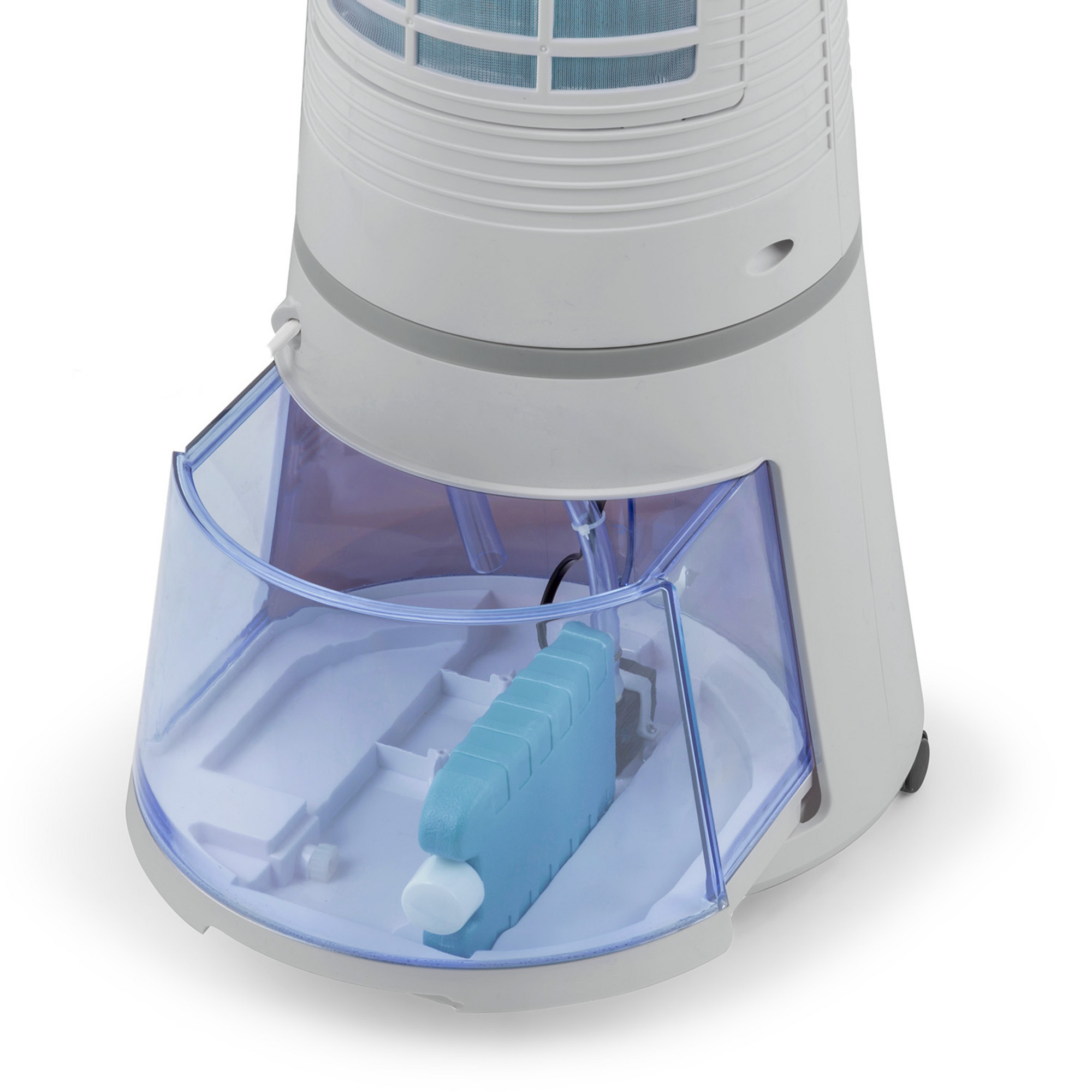 Con un potente caudal de aire de 210 m³/h, el ventilador Skyscraper Ice de Klarstein pone en movimiento el lento aire del verano con 3 velocidades. En combinación con la función de enfriador del aire , el flujo de aire se refresca mediante la evaporación del agua, refrigerada adicionalmente por los bloques de refrigeración. Esto hace que el Skyscraper Ice de Klarstein sea un útil humidificador incluso en invierno. Además, la oscilación vertical y horizontal permite que el flujo de aire se mueva. El ionizador integrado, que elimina eficazmente las partículas de polvo y los olores del aire, garantiza una mejor respiración Gracias a las ruedas de suelo integradas, el enfriador de aire 4 en 1 Skyscraper Ice de Klarstein es extremadamente móvil y el depósito de agua extraíble facilita el llenado, la limpieza y el vaciado.