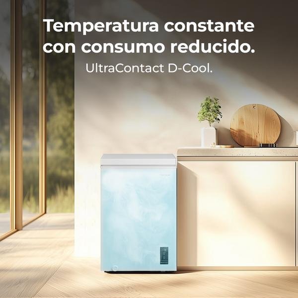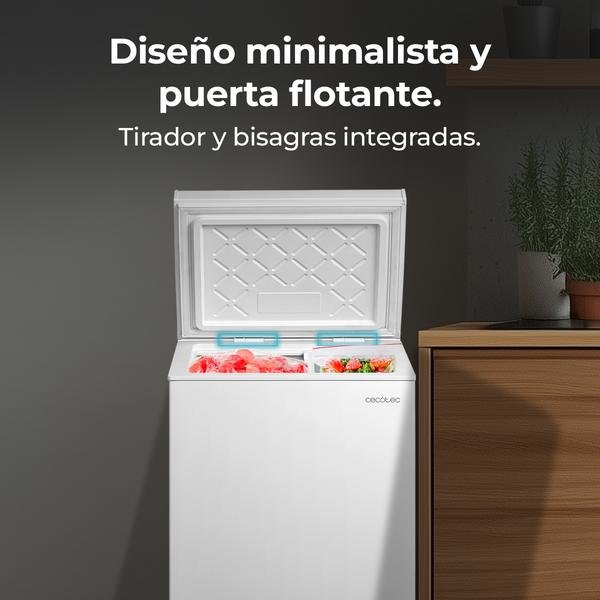 Confort Acústico y Eficiencia Su funcionamiento ultra silencioso permite su integración en cualquier ambiente sin alterar la armonía del hogar. Diseñado para la economía moderna, este congelador transforma cada centímetro en una inversión para tu presupuesto familiar, permitiéndote aprovechar ofertas y conservar alimentos estacionales con la máxima calidad y eficiencia energética.Organización Inteligente y Seguridad Avanzada La cesta con asas ergonómicas facilita la extracción, clasificación y transporte de alimentos, permitiendo acceder cómodamente a productos en todos los niveles. El sistema de alarma monitoriza constantemente la temperatura, alertándote inmediatamente ante cualquier anomalía y protegiendo tu inversión en alimentos.Versatilidad Sin Precedentes Experimenta libertad total con la función Dual que transforma tu electrodoméstico entre congelador y refrigerador según tus necesidades. El display LED proporciona control intuitivo de todos los parámetros, permitiendo ajustes precisos con un simple vistazo y garantizando una experiencia de usuario excepcional.Tecnología de refrigeración equipado con el innovador sistema UltraContact D-Cool, sus conductos de geometría optimizada maximizan la transferencia térmica, proporcionando enfriamiento intenso y uniforme. La función Fast Freezing preserva instantáneamente nutrientes, sabores y texturas, manteniendo la calidad original de tus alimentos hasta el momento de consumo.Diseño Funcional y Capacidad Optimizada El Cecotec Bolero CoolMarket Chest 99P White E redefine la practicidad con su congelador horizontal de 99L. Su diseño minimalista con tirador y bisagras integradas elimina enganchones y facilita su ubicación en cualquier espacio. La revolucionaria ZeroG FlexiDoor permite posicionar la puerta en cualquier ángulo entre 30° y 80°, liberando tus manos mientras garantiza un cierre hermético automático.