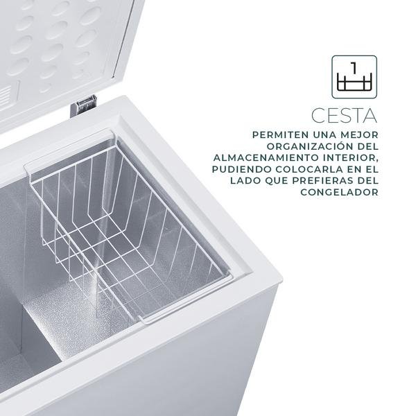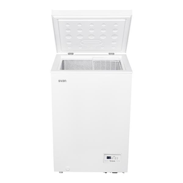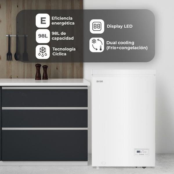 Congelador horizontal de Svan modelo SCH1001EDC. Congelador de tecnología cíclica y sistema Dual Cooling, con motor motor universal y gas R600a. Eficiencia energética E y nivel sonoro máximo de 40 dB. Estética blanca con 1 puerta de abertura tipo uñero. Sistema de control electrónico con Display LED, descongelación manual y funciones con las que sacar el mayor rendimiento al congelador. Congelador 4 estrellas de 98 Litros de capacidad con 1 cesta para la organización del hueco interior. Dimensiones: 846,5 x 538 x 520 mm Conoce más acerca de este modelo: – El sistema Dual Cooling permite configurar la temperatura interior para funcionar como congelador o como refrigerador, según tus necesidades, ofreciendo mayor versatilidad al electrodoméstico.