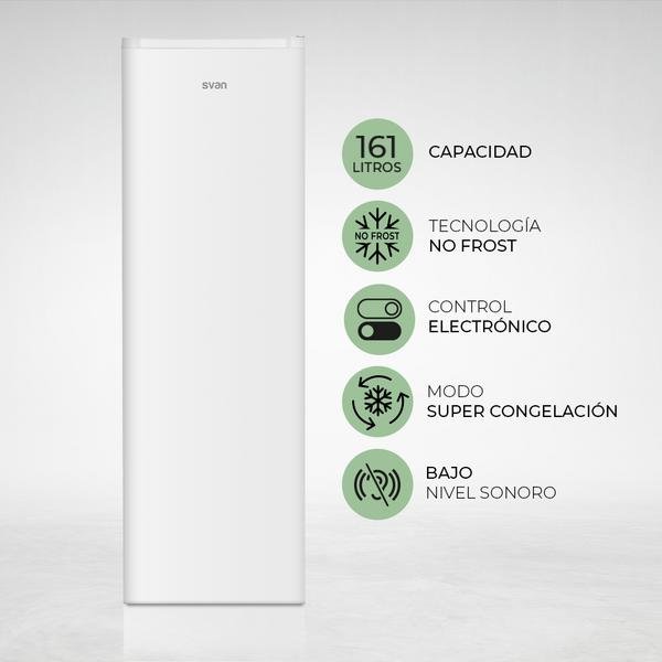Integra en tu hogar la elegancia y eficiencia del Congelador Vertical Svan SCV145500ENF . Equipado con tecnología No Frost y un diseño estético en blanco, este congelador garantiza una experiencia superior en conservación de alimentos. Su puerta reversible se adapta a cualquier espacio, mientras que su avanzado control electrónico y sistema de descongelación automática ofrecen facilidad y conveniencia. Vive la tranquilidad de un ambiente sereno con su bajo nivel sonoro y disfruta de la organización perfecta gracias a sus múltiples compartimentos, todo dentro de una unidad de 161 litros que redefine la eficiencia energética. El complemento ideal para tu cocina moderna.