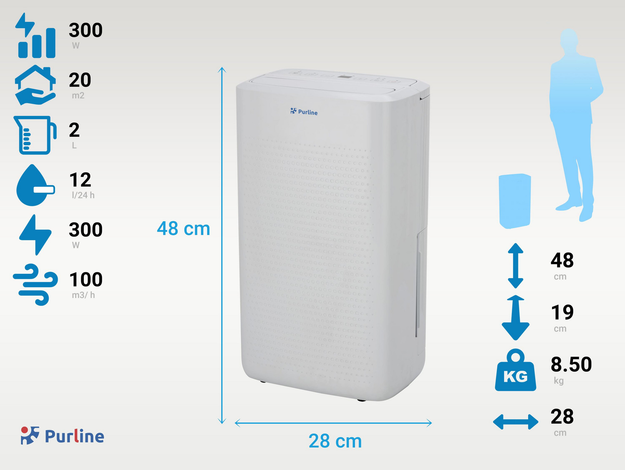Con un diseño moderno y compacto (28x19x48 cm, 9 kg), el DRYOS 12 es fácil de transportar gracias a su asa integrada, ideal para espacios de hasta 20 m2. Su funcionamiento silencioso ( El DRYOS 12 no solo controla la humedad, sino que transforma tu hogar en un espacio más saludable y confortable. ¡Hazlo parte de tu hogar hoy mismo y disfruta de un aire más limpio y fresco!