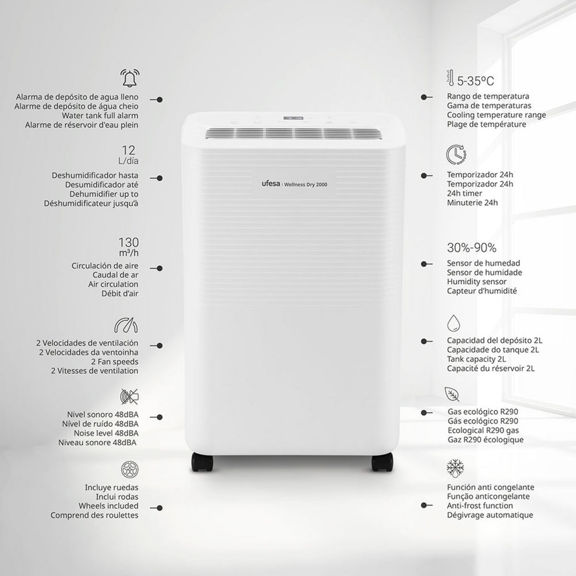 Gracias a sus ruedas integradas, podrás transportarlo fácilmente de una habitación a otra. Ligero, compacto y eficiente, el Wellness Dry 2000 se adapta a cualquier espacio, convirtiéndose en el aliado perfecto para mejorar la calidad del aire en tu hogar.