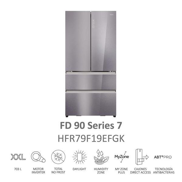 Frigorífico americano – Haier FD 90 Series 7 HFR79F19EFGK, No Frost lateral, 190 cm, 703 l, Motor Inverter, Antibacterias Pro, Cristal Zafiro