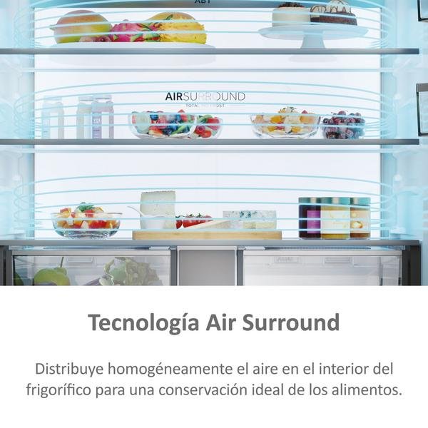La tecnología exclusiva Haier Air Surround Fresher Tech distribuye el aire frío de forma homogénea y envolvente mediante salidas laterales especiales que abrazan los alimentos sin flujo directo sobre ellos, evitando el resecado y la pérdida de peso, certificado por laboratorio externo independiente para mantener sabor, textura y jugosidad hasta un 99% después de 7 días.