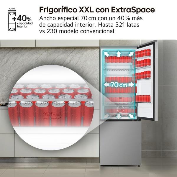 Ancho especial 70 cm con un 40 % más de capacidad interior. Hasta 321 latas vs 230 modelo convencional.