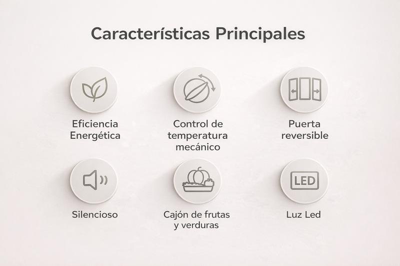 Características destacadas: Tamaño Amplio y Organización Inteligente: Capacidad de 244 litros con estantes ajustables, 3 compartimentos en la puerta y un gran cajón para frutas y verduras. Tecnología de Congelación Rápida: Congelador con 3 cajones transparentes para un acceso fácil y mejor organización. Eficiencia Energética E: Bajo consumo de 194 kWh al año, reduciendo costos eléctricos sin comprometer rendimiento. Puertas Reversibles: Se adapta a tu cocina con la posibilidad de cambiar la dirección de apertura de la puerta. Iluminación LED: Mejor visibilidad en el interior con menor consumo de energía. 🏡 Ideal para hogares y negocios: