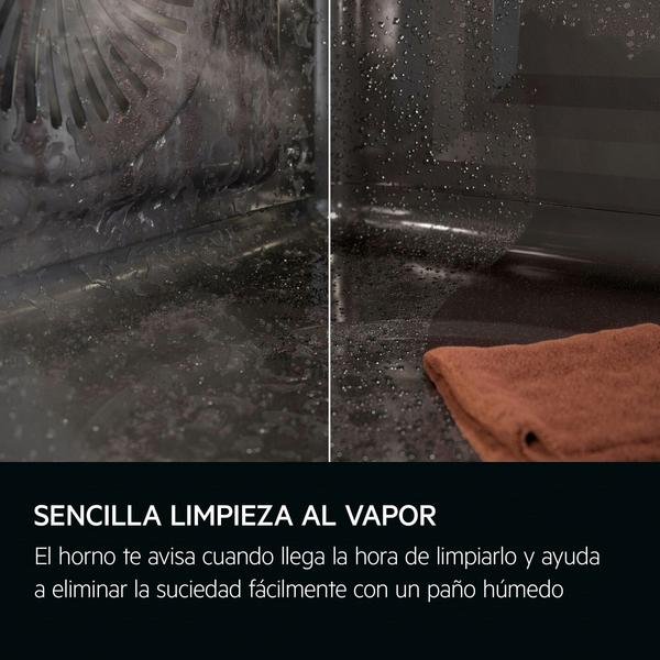 Limpia tu horno de manera natural y sencilla con agua. El agua añadida en el horno crea vapor para aflojar la suciedad incrustada en la superficie, lo que te permite eliminarla fácilmente con un paño húmedo.
