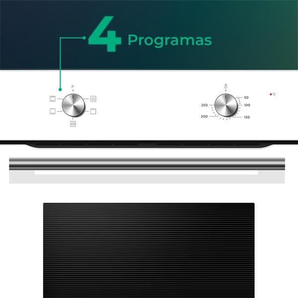 Estética blanca con puerta de doble cristal. Dispone de soporte metálico para las bandejas e iluminación interior. Panel de control manual y mandos estándar, con termostato y temporizador mecánico. Ofrece 4 programas de cocción y diversas funciones para obtener el mayor rendimiento y facilitar el proceso de cocción.