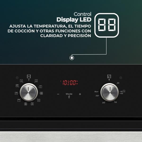 Estética de cristal negro con puerta de doble cristal. Dispone de guías telescópicas, soporte metálico para las bandejas e iluminación interior. Panel de control táctil con Display LED y mandos estándar, con termostato y temporizador digital. Ofrece 10 programas de cocción y diversas funciones para obtener el mayor rendimiento y facilitar el proceso de cocción.