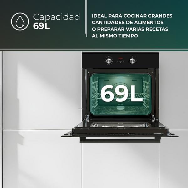 Horno eléctrico de 69 Litros de capacidad y potencia total 3100 W. Eficiencia energética A.