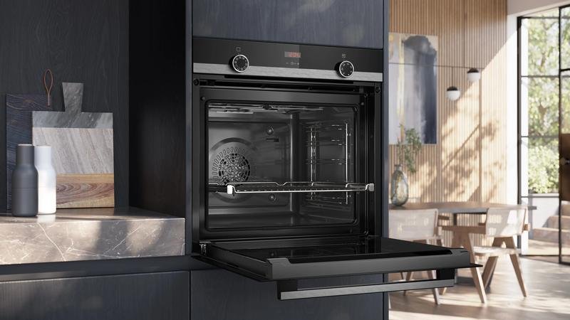 Perfecto para una limpieza rápida del día a día. Con humidClean, limpiar el horno es más fácil que nunca. Basta con añadir una gota de detergente a 400 ml de agua, verter esta solución en la base del horno completamente frío y dejar que se evapore en cuatro minutos a una temperatura mínima de 80 °C. Después de una breve fase de enfriamiento, podrás eliminar fácilmente la suciedad reblandecida con un paño de cocina o cepillo suave.