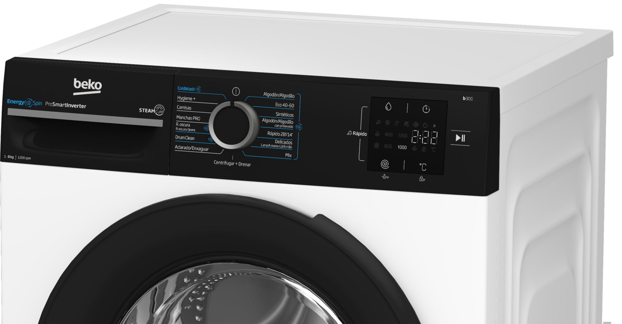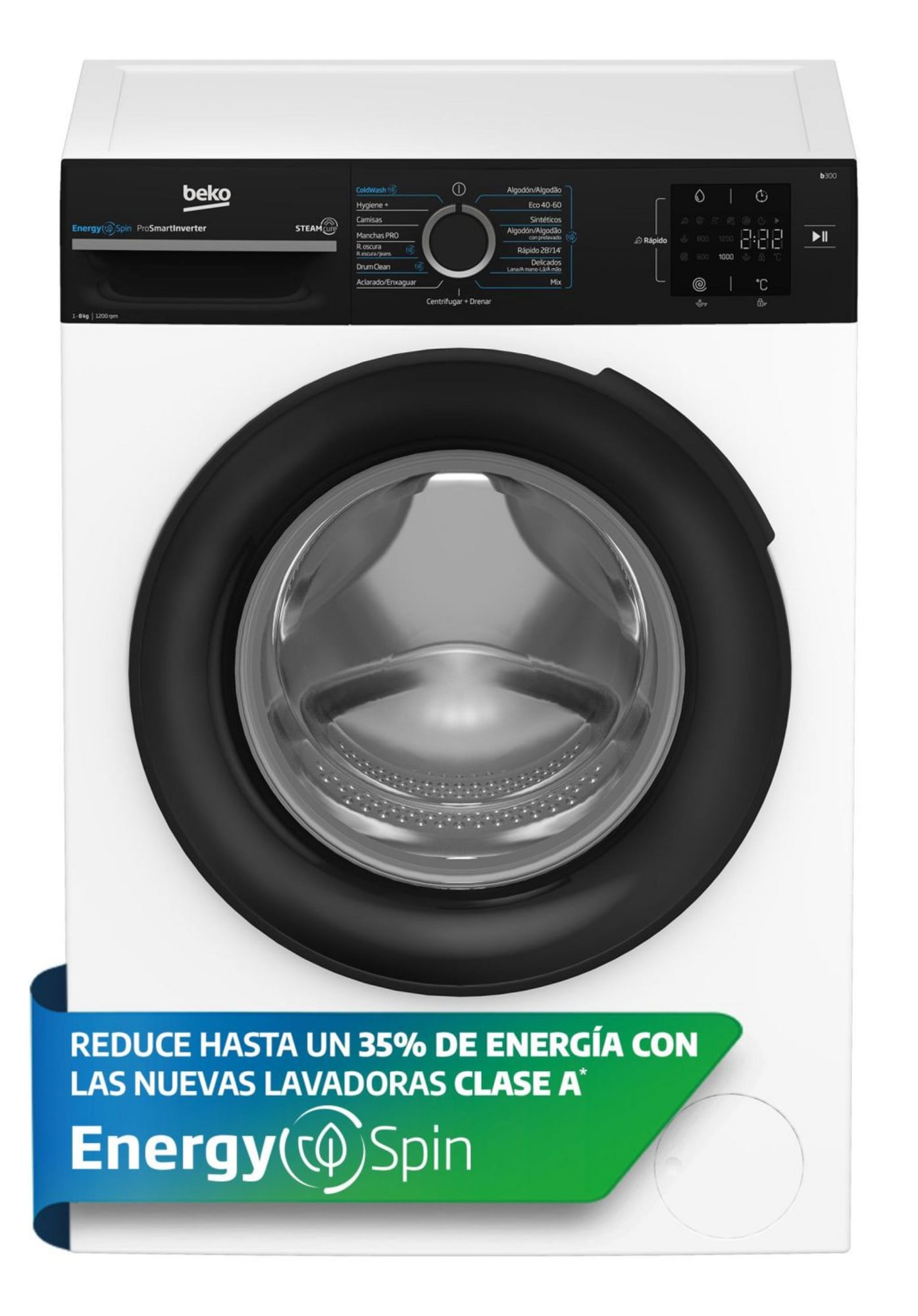 Lavadora carga frontal – Beko Energy Spin BM3WFSU38213, 8 kg, 1200 rpm, 15 Programas, Motor ProSmart Inverter, Función Vapor, Blanco