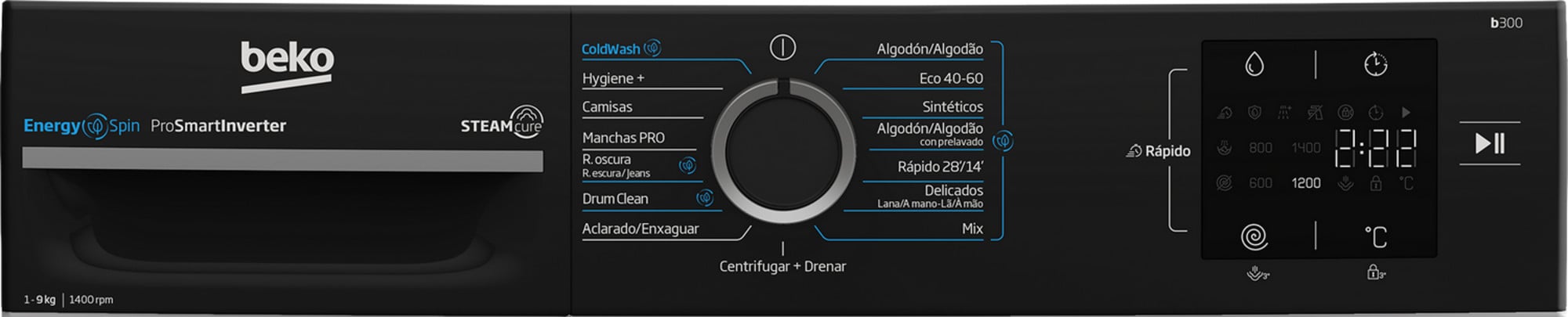 | Programas | Algodón, ECO 40-60, Sintéticos, Algodón 60º con prelavado, Mini/Mini14′, Delicados, Mix, Centrifugado y vaciado, Ropa oscura/Jeans, Manchas, Camisas, Hygiene+, Lavado en frío |