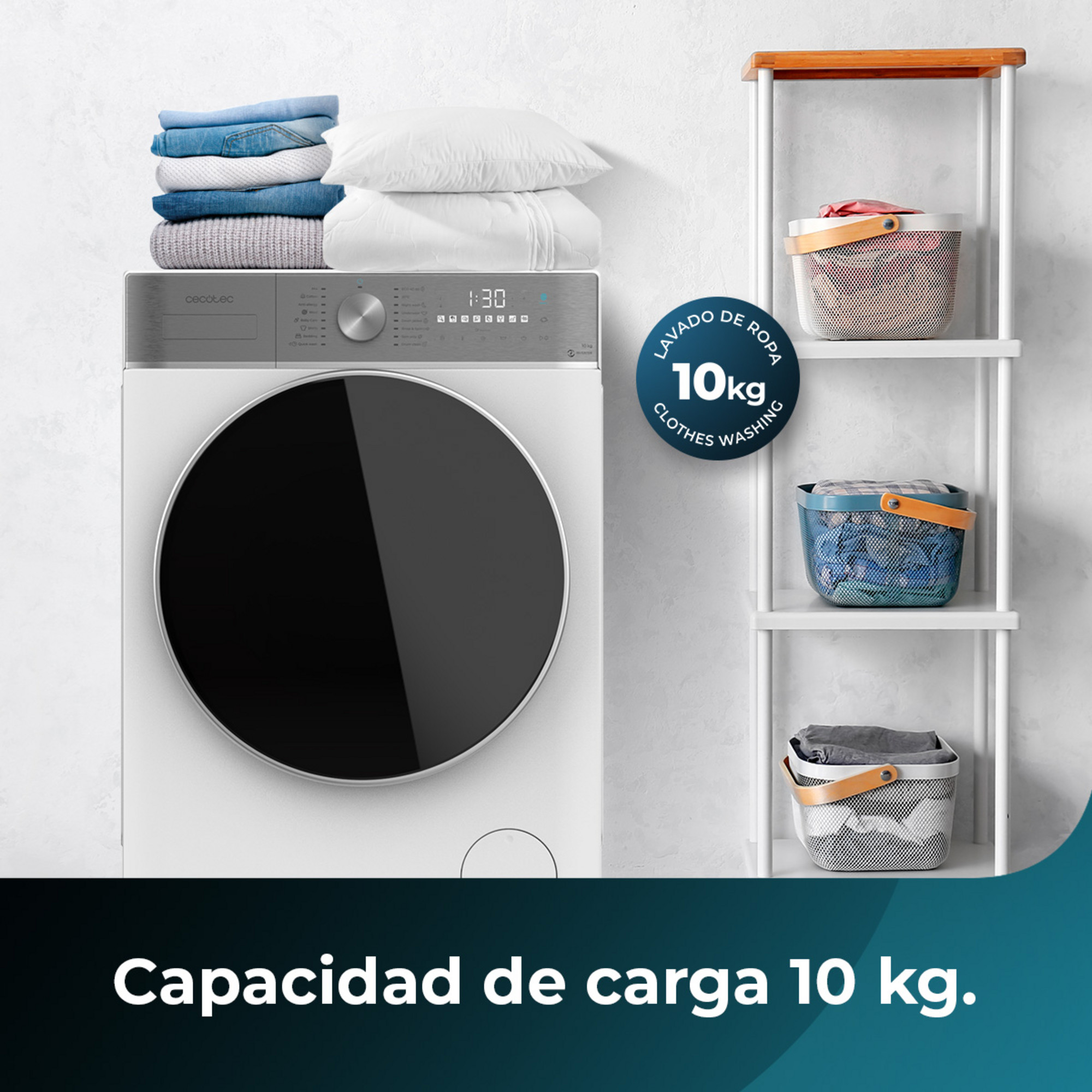 | Caract. especiales | Lavadora de carga frontal de 10 kg de capacidad y 1400 rpm, 16 programas,Clase A, Motor Inverter Plus, Steam Max, lavado inteligente y detector de carga. |