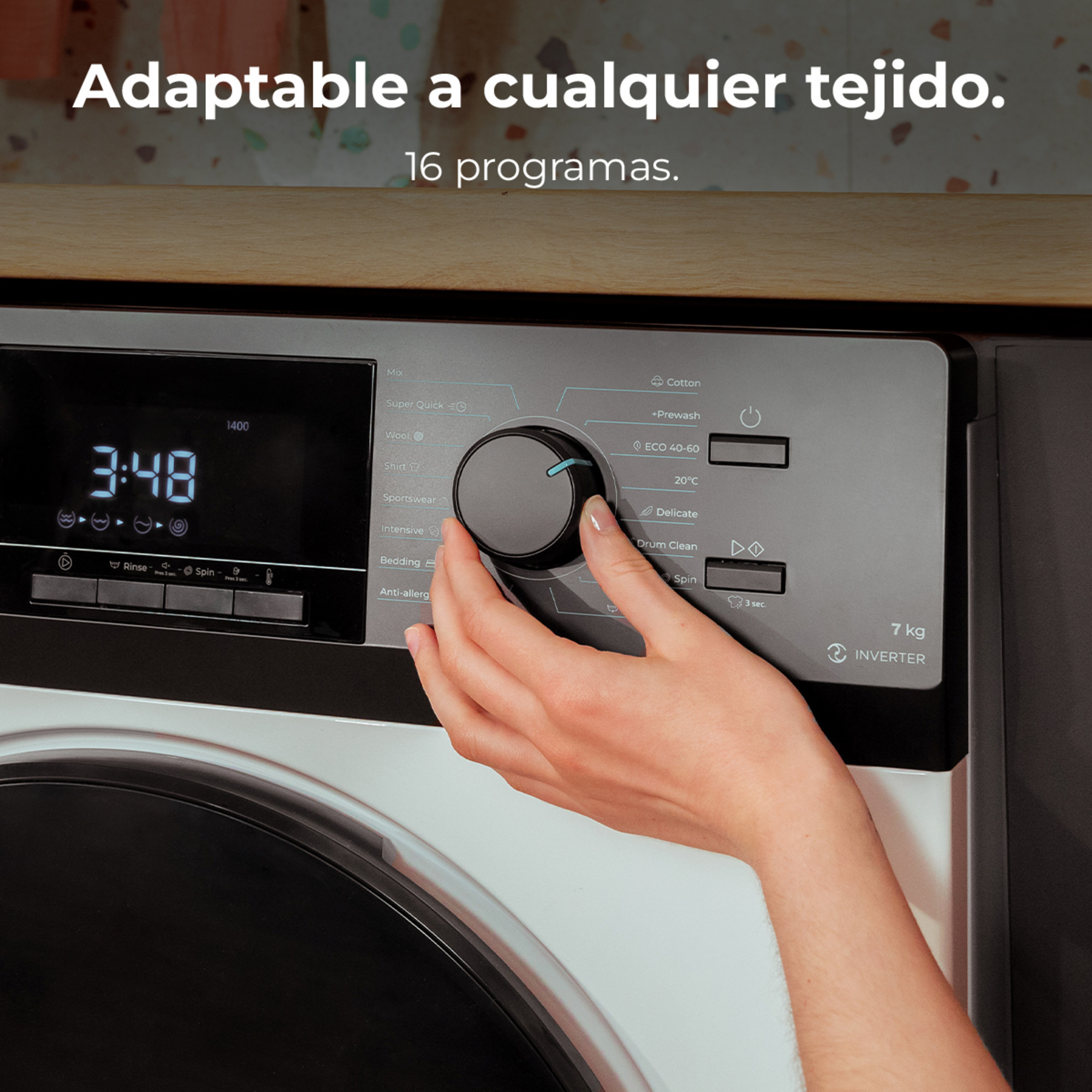 Esta lavadora con capacidad de 7 kg es ideal para el lavado eficiente de las prendas diarias, ofreciendo la flexibilidad necesaria para adaptarse a las necesidades de cualquier hogar. Con una velocidad de hasta 1200 rpm, puedes personalizar el ciclo de lavado según tus requerimientos específicos, asegurando un cuidado óptimo para cada tipo de tejido. Además, cuenta con 16 programas de lavado que proporcionan la versatilidad necesaria para tratar desde los tejidos más delicados hasta los más resistentes.La eficiencia energética es una de las características destacadas de esta lavadora, ya que ofrece una clasificación de clase A, superando los estándares oficiales con un 10% de ahorro adicional. Gracias a su tecnología innovadora, cada ciclo se optimiza para ofrecer un lavado rápido y perfecto, reduciendo el consumo de energía y convirtiéndola en la elección ideal para tu hogar y el cuidado del medio ambiente. El Motor Inverter Plus garantiza un rendimiento superior y una durabilidad excepcional, reduciendo vibraciones y ruido para un funcionamiento silencioso y promoviendo un ahorro energético significativo.La función SteamMax utiliza vapor para envolver y penetrar cada prenda, asegurando una esterilización profunda y la eliminación eficaz de manchas y olores. El programa Drum Clean se encarga de la autolimpieza del tambor, previniendo la acumulación de bacterias y manteniéndolo libre de suciedad y malos olores. Para quienes requieren un cuidado especial, el programa Allergy Care esteriliza la ropa usando vapor y agua a altas temperaturas, siendo perfecto para pieles sensibles.Con la función Delay Start, puedes programar tus lavados con hasta 24 horas de antelación, ajustando el inicio del ciclo para que se adapte a tu horario. El tambor Diamond Care protege tus prendas en cada lavado gracias a su diseño en forma de diamante, proporcionando un tratamiento delicado y eficaz. La función Stop&Go ofrece flexibilidad y conveniencia al permitir pausar el ciclo de lavado.