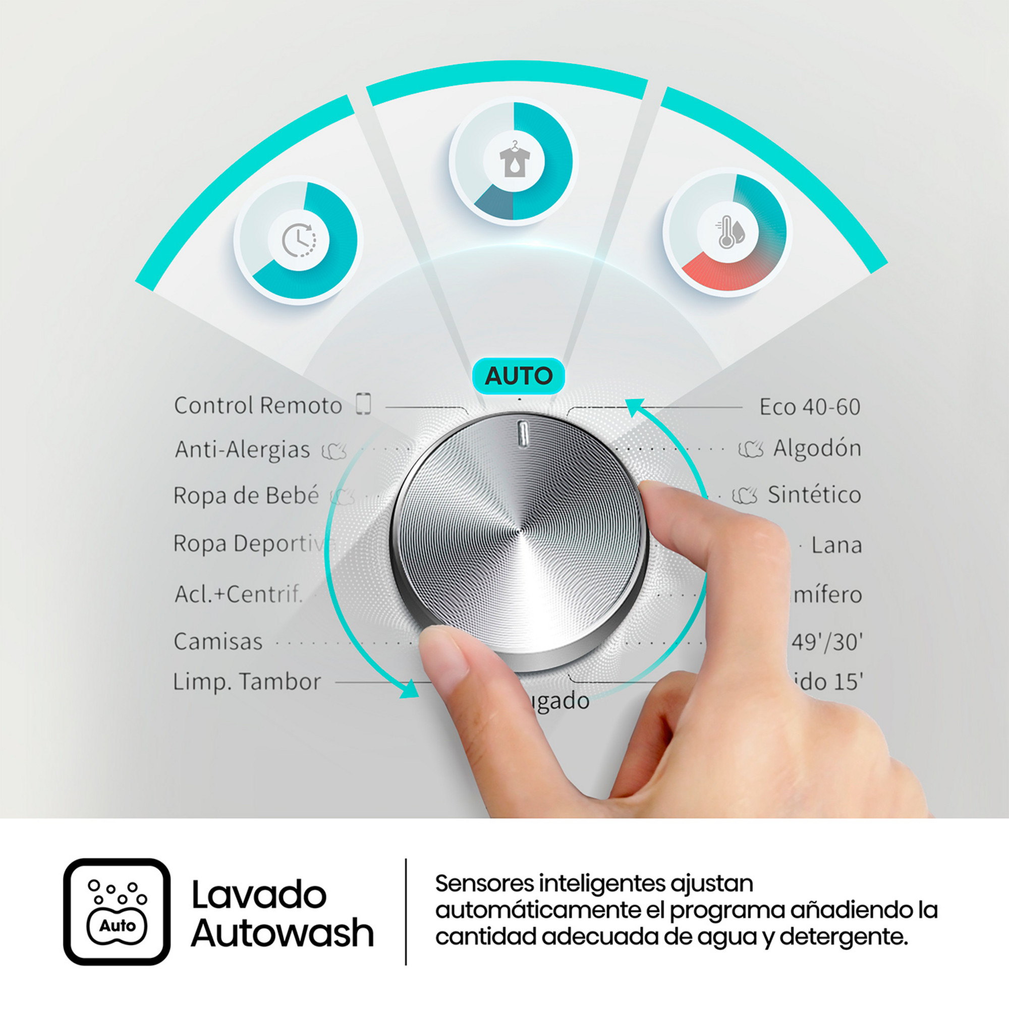 Sensores inteligentes ajustan automáticamente el programa de lavado y añade la cantidad adecuada de agua y detergente para una limpieza óptima y eficiente.