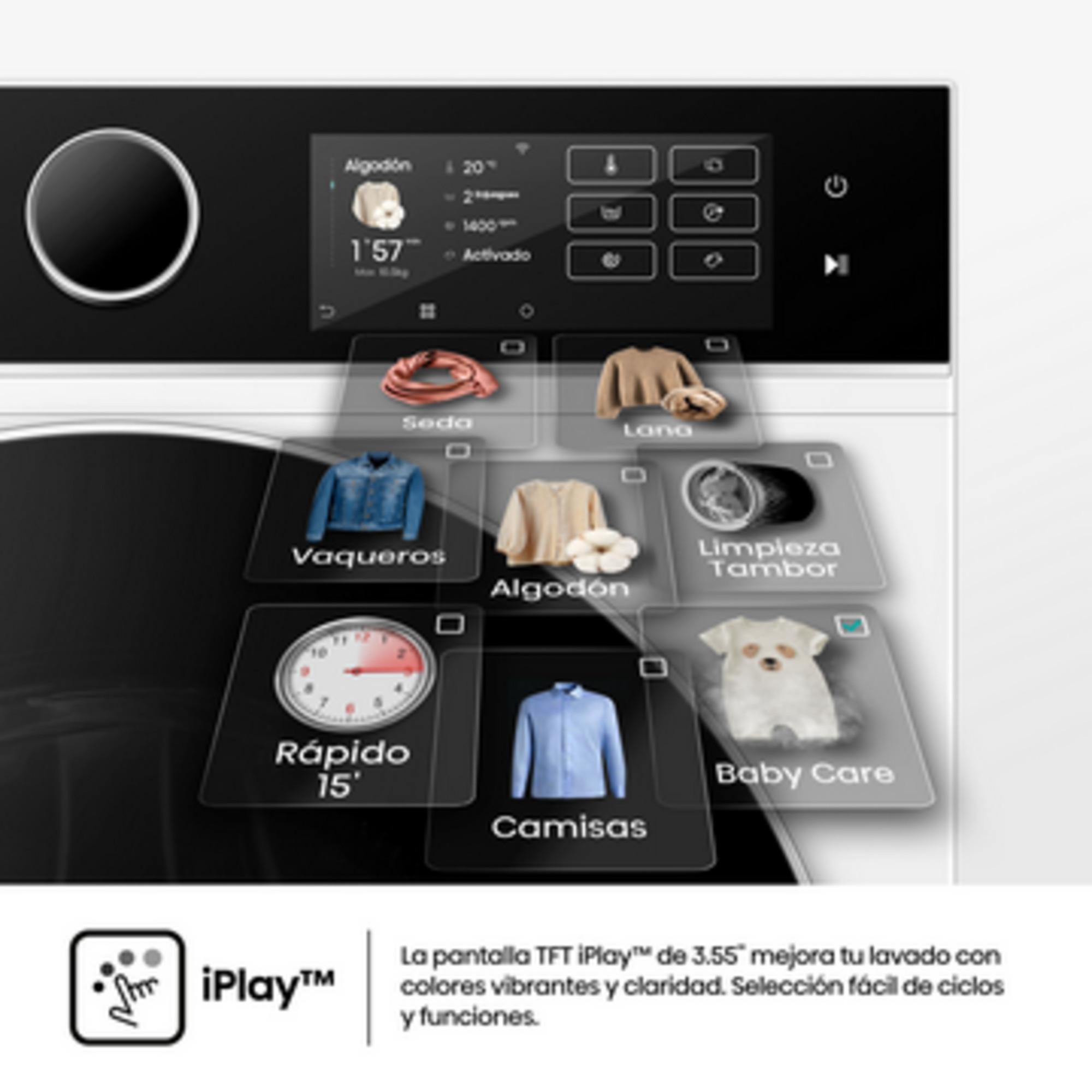 La pantalla TFT iPlay™ de 3.55 facilita la selección de programas y funciones gracias a sus intuitivas imágenes a color.