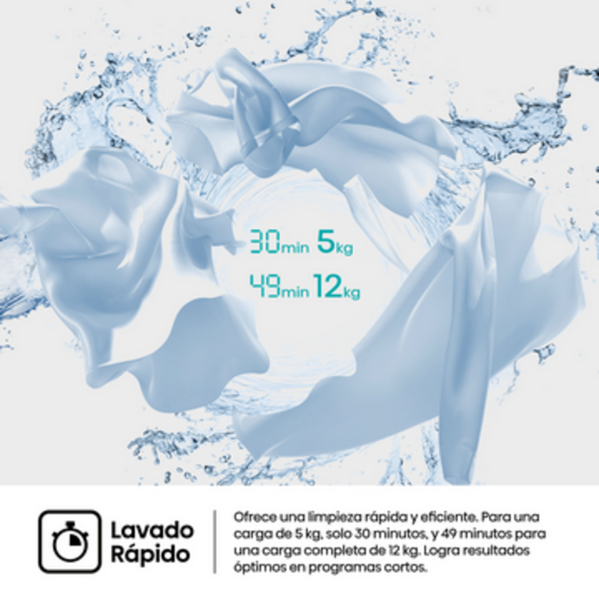 Ofrece una limpieza rápida y eficiente. Para una carga de 5 kg, solo 30 minutos, y 49 minutos para una carga completa de 12 kg. Logra resultados óptimos en programas cortos.