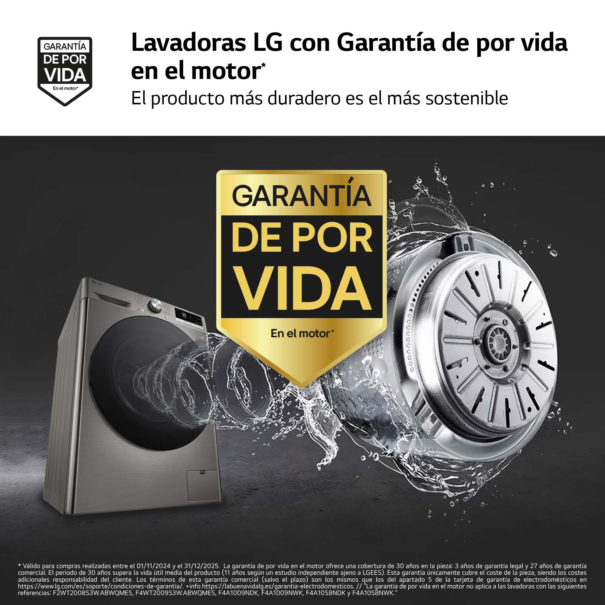 Válido para compras realizadas entre el 01/11/2024 y el 31/12/2025. La garantía de por vida en el motor ofrece una cobertura de 30 años en la pieza: 3 años de garantía legal y 27 años de garantía comercial, presidiendo el 30 años supera la vida útil media del producto (11 años según un estudio independiente ajeno a LGEES). Esta garantía únicamente cubre el coste de la pieza, siendo los costes adicionales responsabilidad del cliente. Los términos de esta garantía comercial (30 años) son los mismos que los de la garantía de grandes electrodomésticos en https://www.lg.com/es/support/condiciones-de-garantia/ y en https://fabianounegocios.es/garantia-electrodomesticos/ . La garantía de por vida en el motor no aplica a las lavadoras con las siguientes referencias: F2WT20085SVA8WQMGES, F4WT2090S3W.ABWQMGES, F4WT2090S3W.ABWQMGES, F4A1090NBK.ABWQMGES, F4A1090NBK.ABWQMGES, F4A1090NBK.ABWQMGES, F4A1090NBK.ABWQMGES, F4A1090NBK.ABWQMGES.