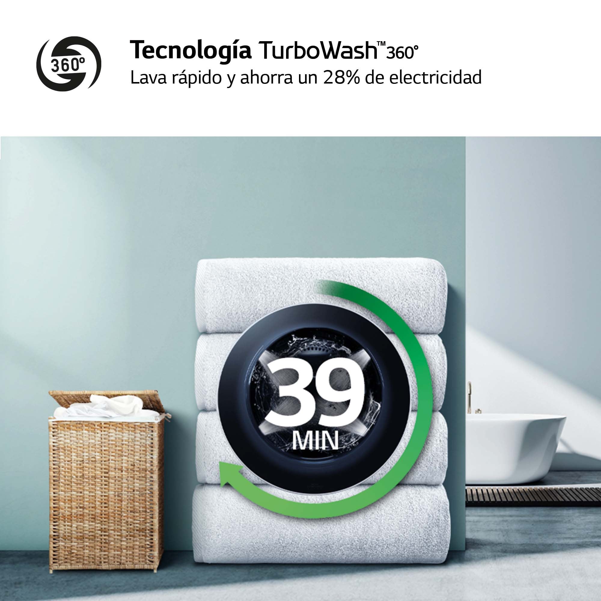 *Probado por la entidad independiente Intertek. Estudio basado en la norma IEC 60456: edición 5.0. Basado en un ciclo Turbowash con una duración de 39 minutos con 5 kg de carga IEC comparado con el ciclo de algodón convencional TurboWash. Los modelos comparados fueron el F4V9RWP2W frente al FC1450S2W. Los resultados reales pueden variar dependiendo de la ropa y el entorno. Para más información, visite (www.lg.com/es).