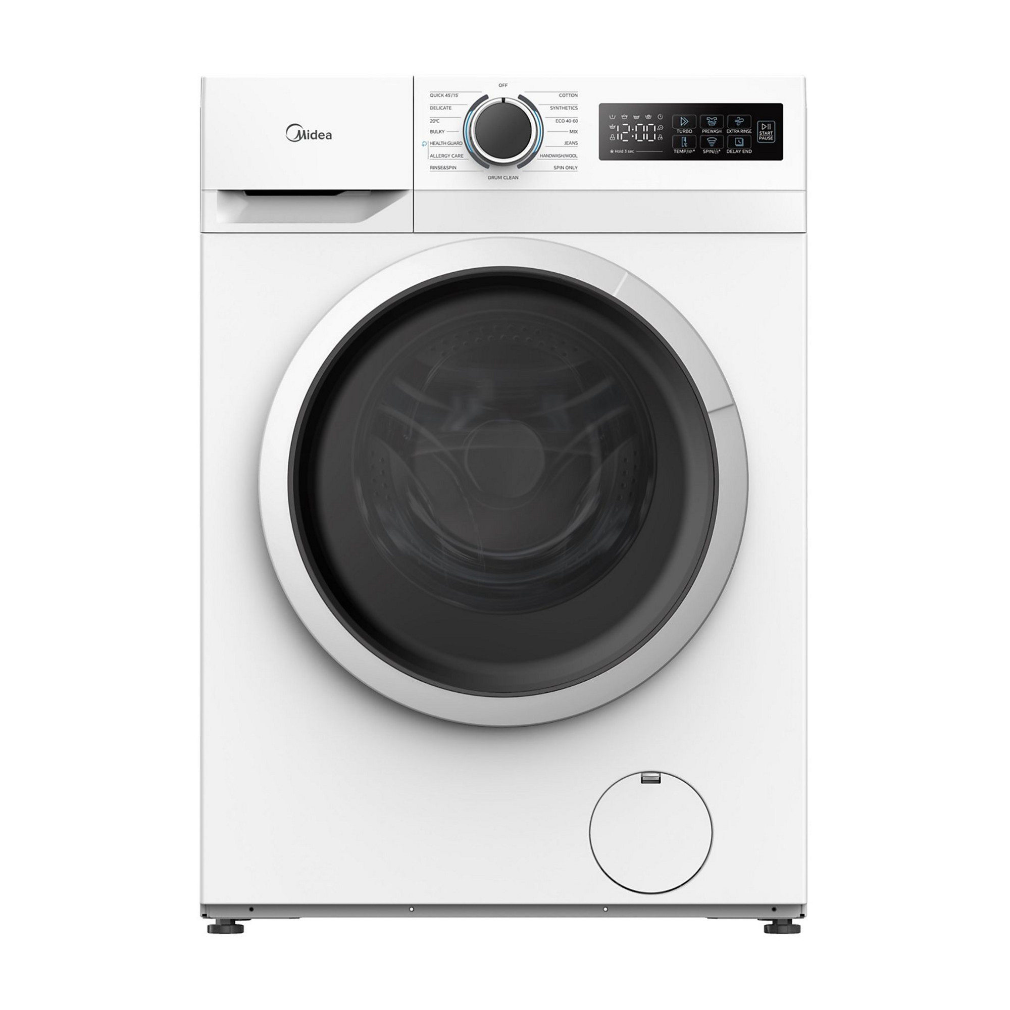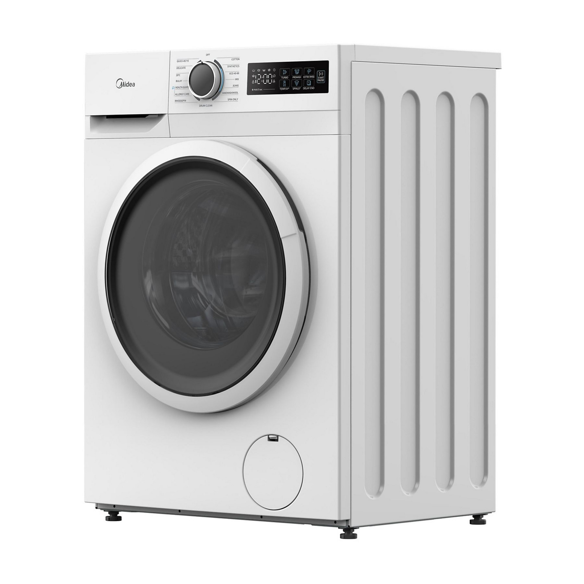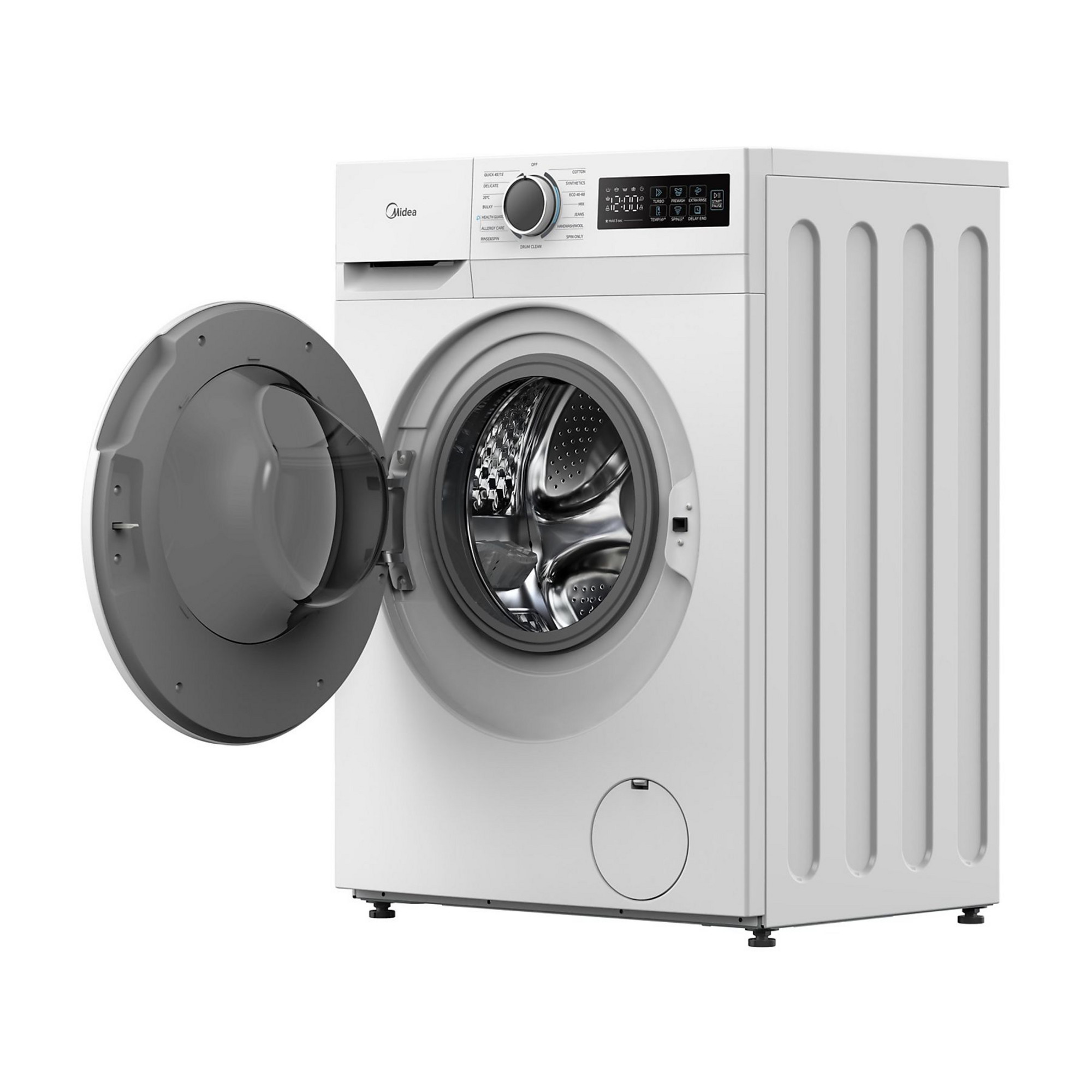 Midea MF110W90BA10. Tipo de carga: Carga frontal. Capacidad nominal: 9 kg, Clase de secado por giro: B, Nivel de ruido (spin): 72 dB, Máxima velocidad de centrifugado: 1400 RPM. Color del producto: Blanco. Ancho: 595 mm, Profundidad: 595 mm, Altura: 850 mm. Clase de eficiencia de energía: A