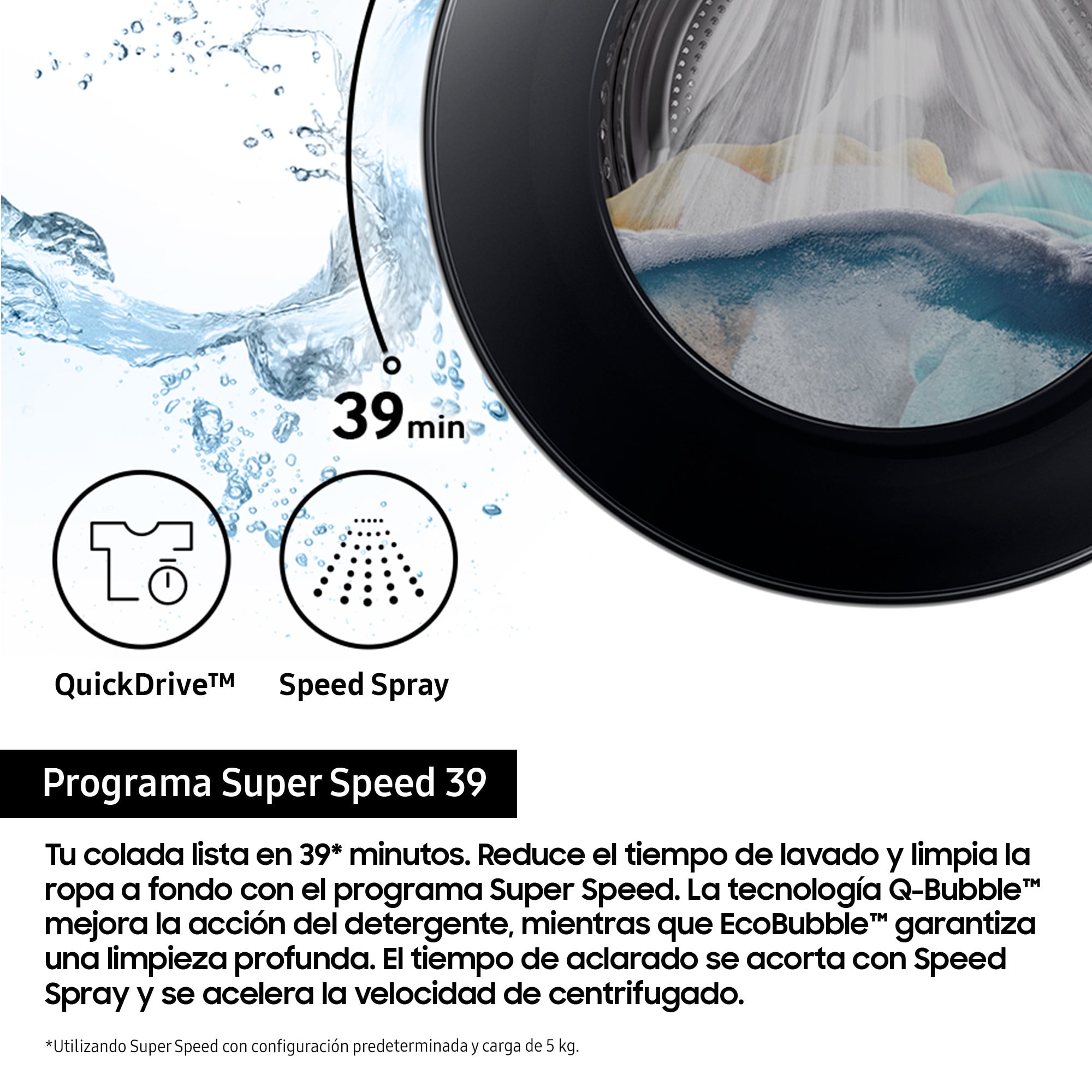 Tu colada lista en 39* minutos. Reduce el tiempo de lavado y limpia la ropa a fondo con el programa Super Speed. La tecnología Q-Bubble™ mejora la acción del detergente, mientras que EcoBubble™ garantiza una limpieza profunda. El tiempo de aclarado se acorta con Speed Spray y se acelera la velocidad de centrifugado.