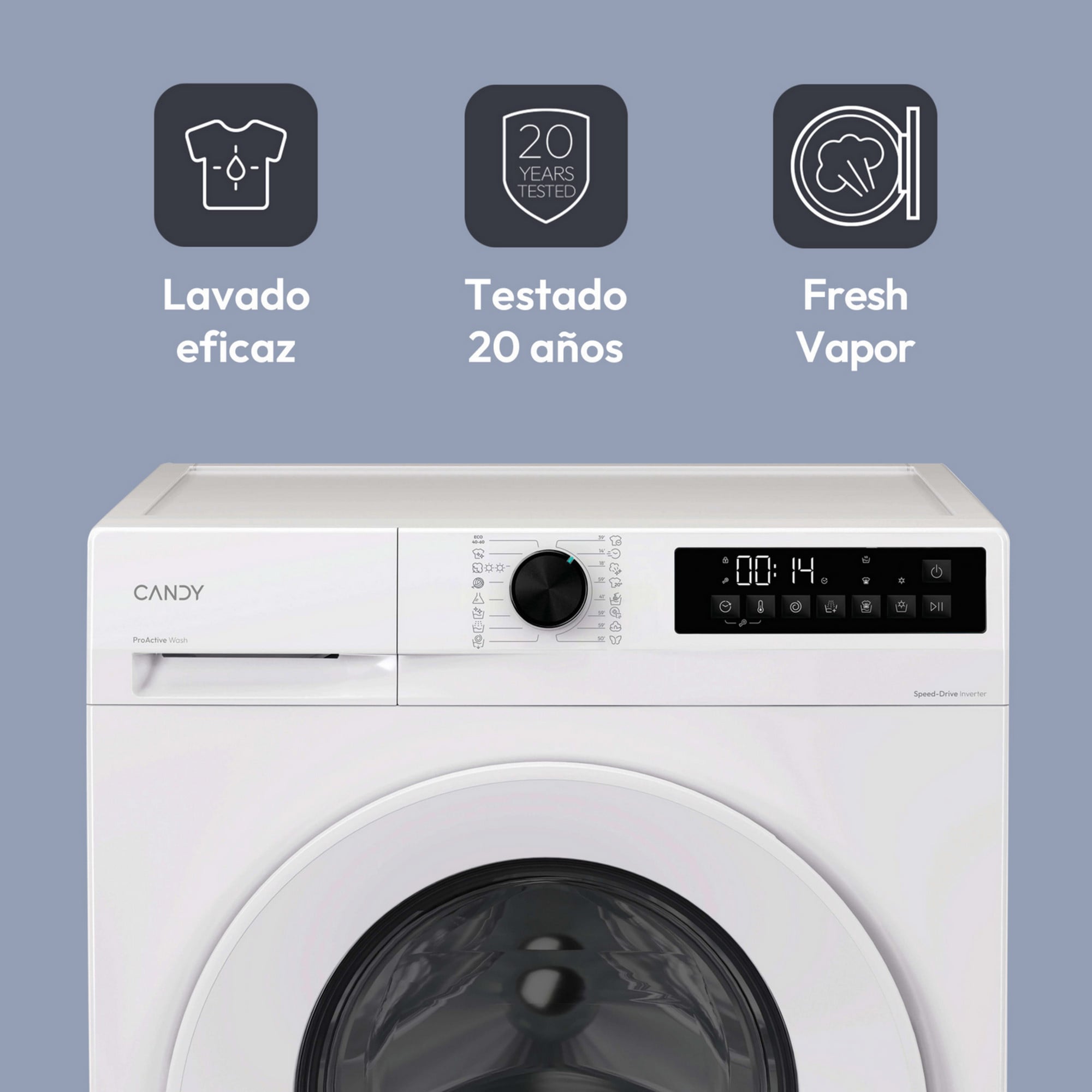 Con la tecnología ProActive Wash de Candy y su exclusivo sistema de inyección de agua, cada lavado es rápido, uniforme y suave, eliminando el 99 % de las manchas diarias y proporcionando un cuidado perfecto a todos los tejidos, incluso en ciclos rápidos. Lavar la ropa nunca ha sido tan fácil.