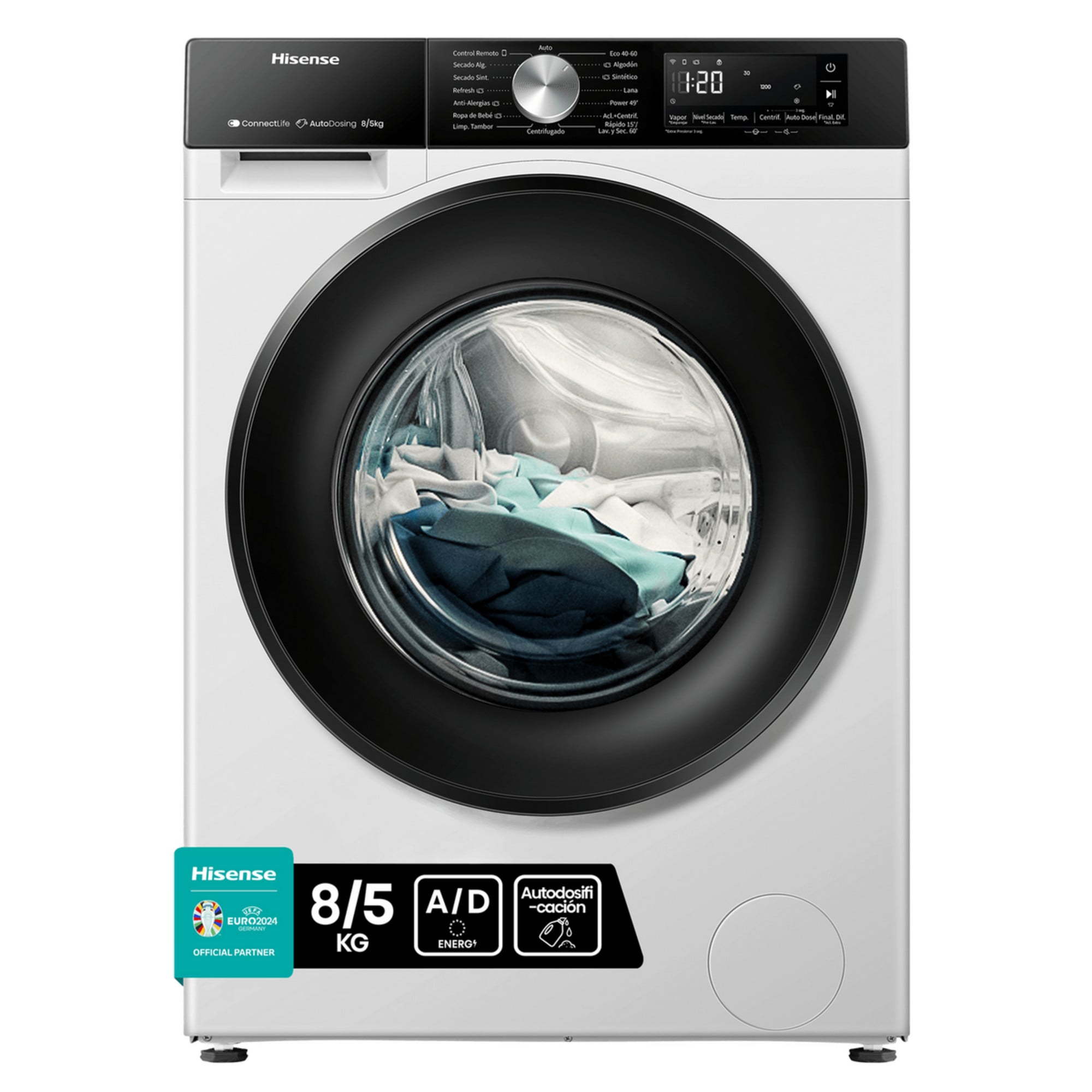 Con una capacidad de lavado de 8 kg y una capacidad combinada de lavado y secado de 5 kg, este modelo ofrece un rendimiento robusto y eficiente. Clasificado con la clase de centrifugado B, presenta un tiempo de ciclo de lavado de 218 minutos y un ciclo de lavado y secado de 479 minutos. Los programas de lavado incluyen opciones como Automático, Pre-lavado y Quick 15min. La velocidad máxima de centrifugado es de 1400 RPM, con un nivel de ruido de 72 dB, clasificado como Clase de Emisión de Ruido A.