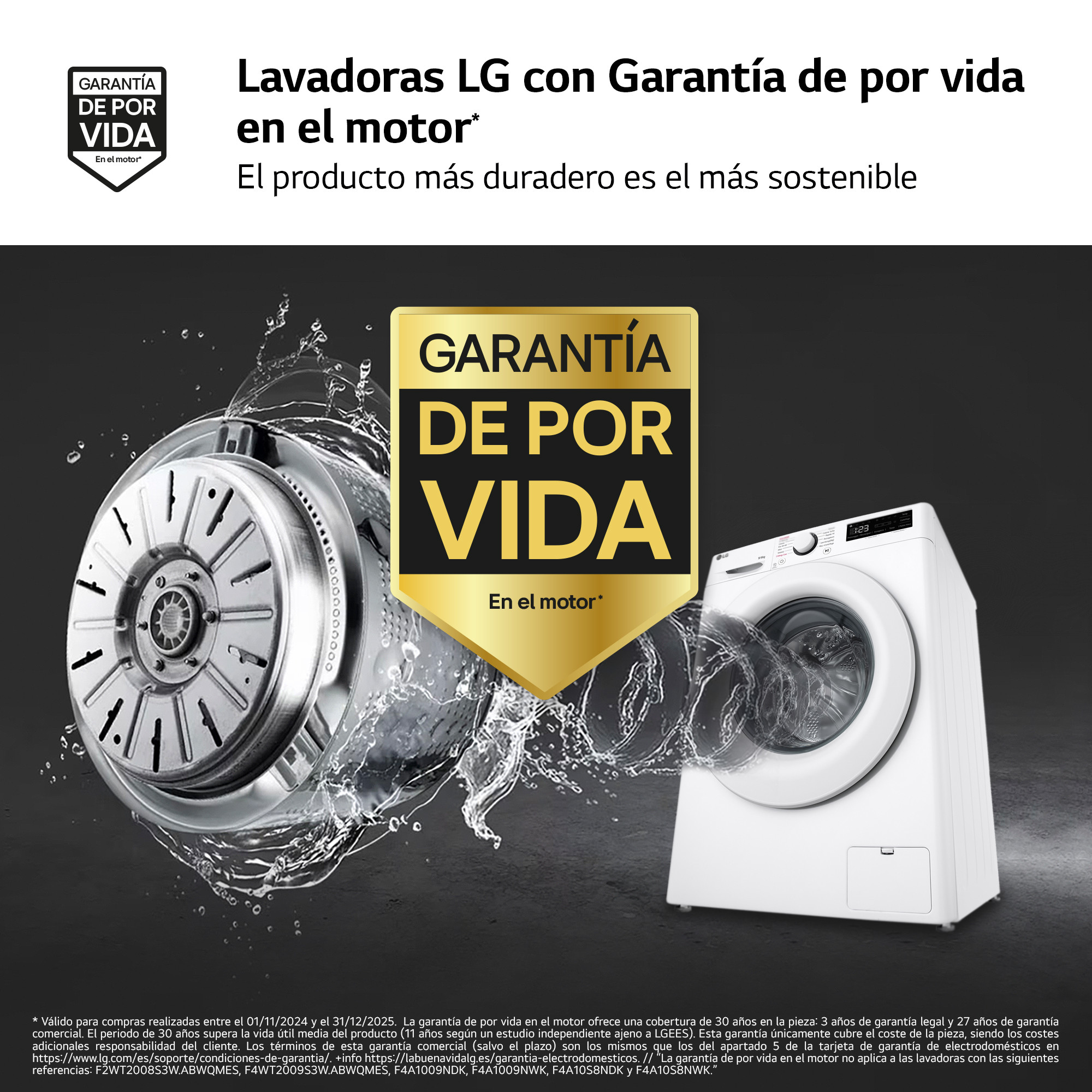 *Válido para compras entre el 01/11/2024 y 31/12/2025. La garantía de por vida del motor de la lavadora ofrece una cobertura de 30 años sobre la pieza: 3 años de garantía legal y 27 de garantía comercial. Esta garantía únicamente cubre el coste de la pieza (gastos adicionales a cargo del cliente). La cobertura ofrecida supera la vida útil media del producto (11 años, según un estudio independiente). Modelos excluidos e información adicional en https://labuenavidalg.es/garantia-electrodomesticos