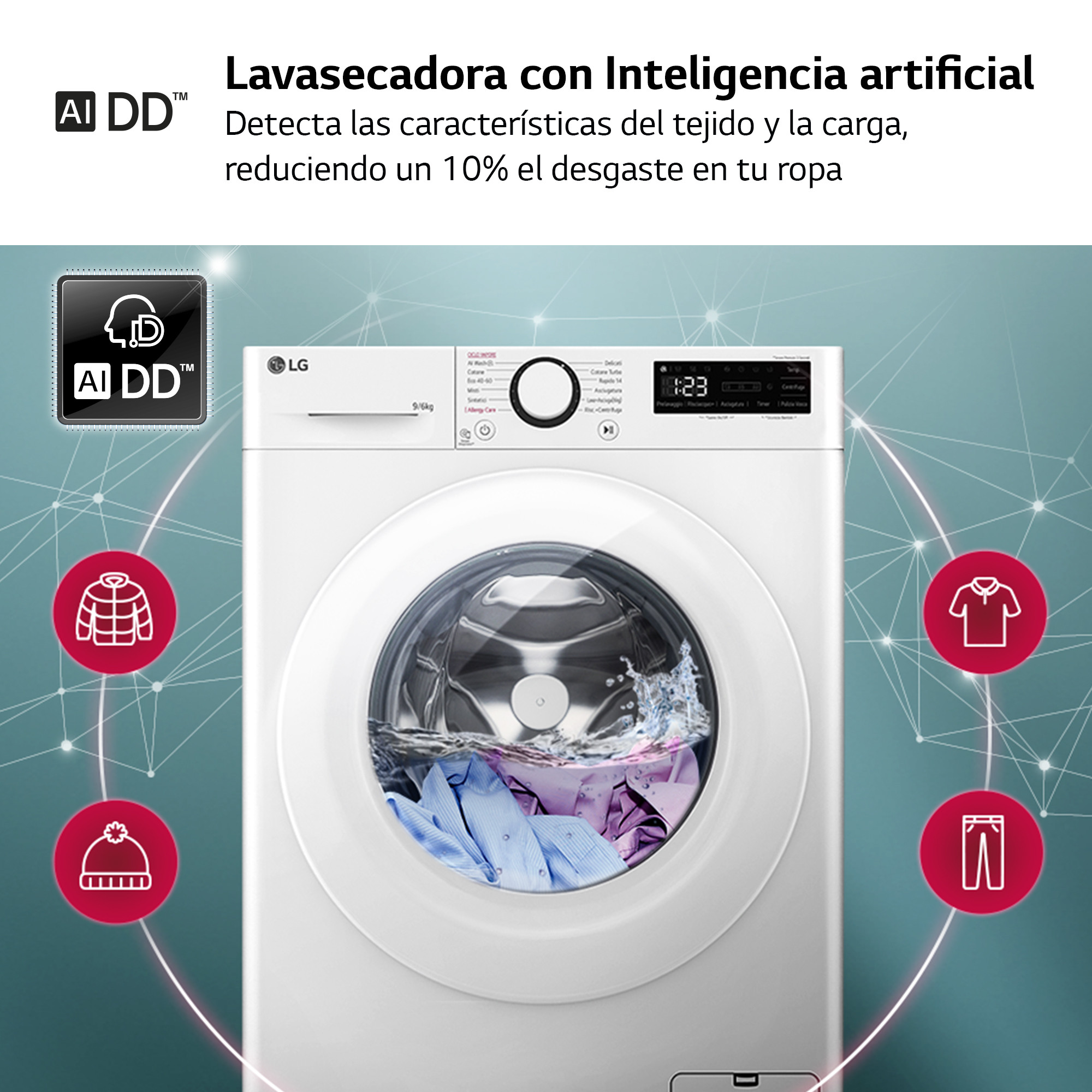 El motor AI DD™ con Inteligencia Artificial detecta las características de los tejidos y establece los movimientos óptimos del tambor para un mayor cuidado de la ropa.