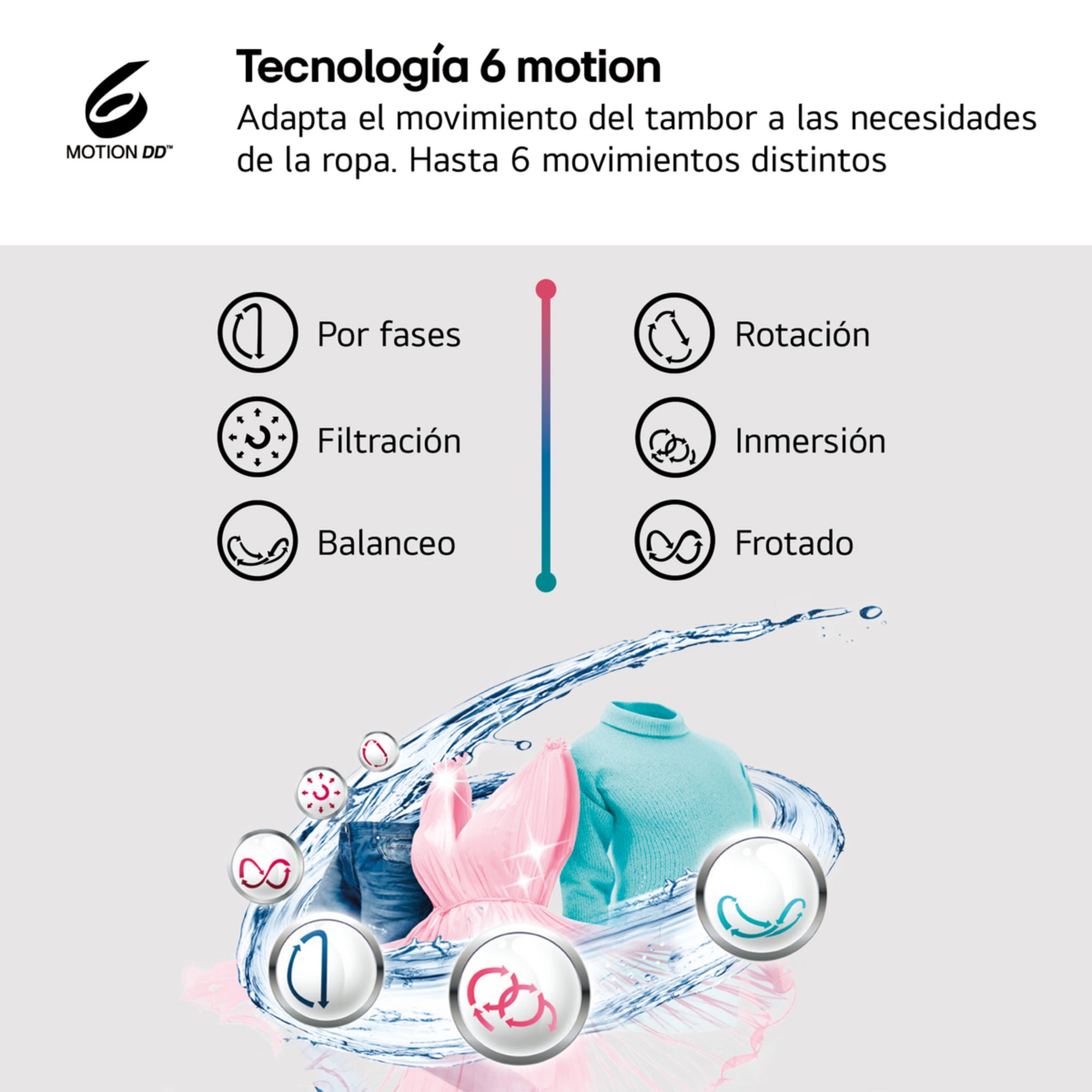 Cuida tu ropa gracias al motor con 6 movimientos diferentes, que adapta el movimiento del tambor a las necesidades de los tejidos.