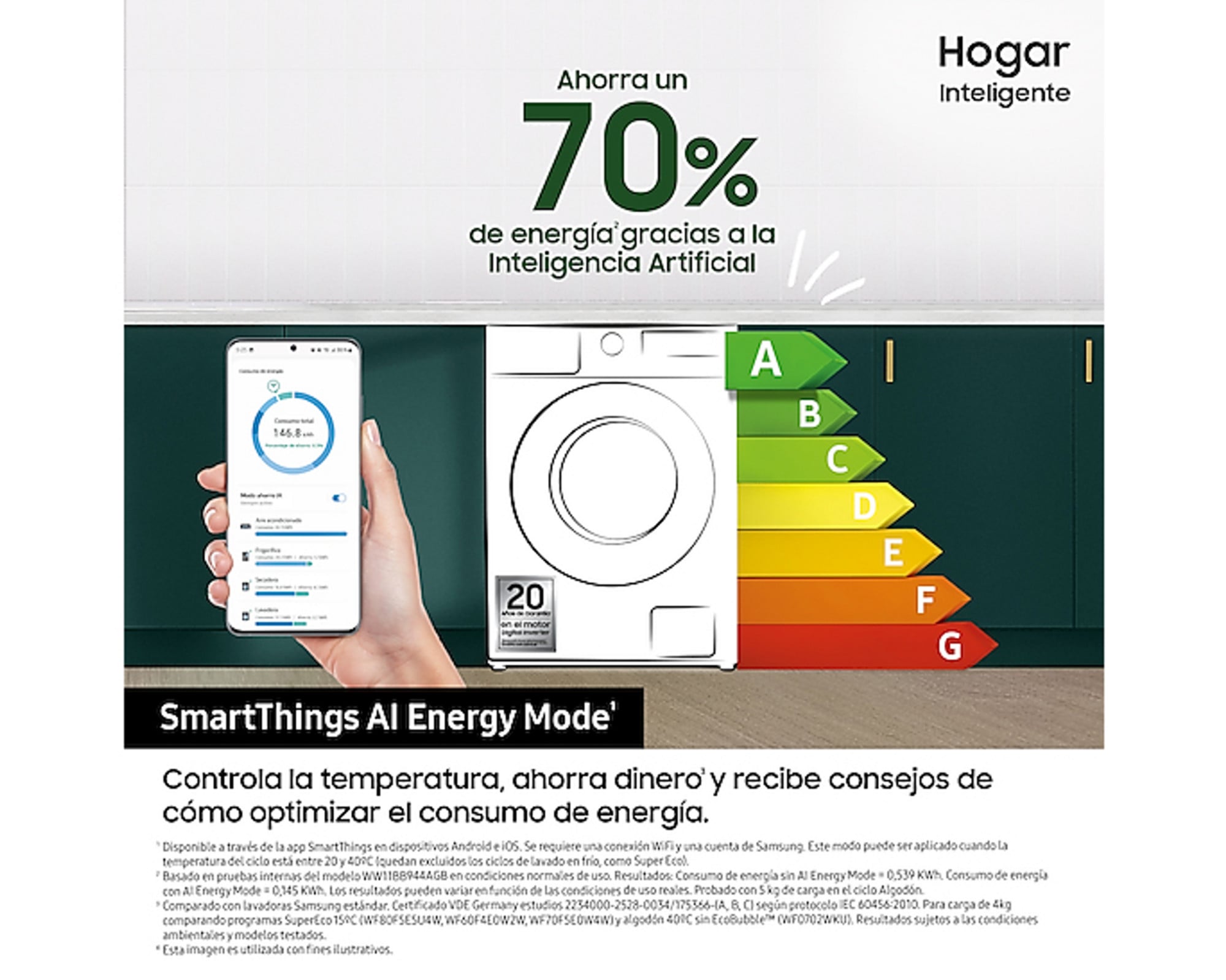Caract. especiales Ahorra energía de una forma inteligente SmartThings AI Energy Mode Controla y reduce el consumo de energía de la lavadora. Energy Mode te permite comprobar el consumo de energía y calcular tu factura de la luz. Este modo reduce el uso de energía hasta un 70%, utilizando Ecobubble™ para lavar con agua fría en lugar de caliente y un tiempo de ciclo extra. Conecta tu vida con SmartThings Wi
