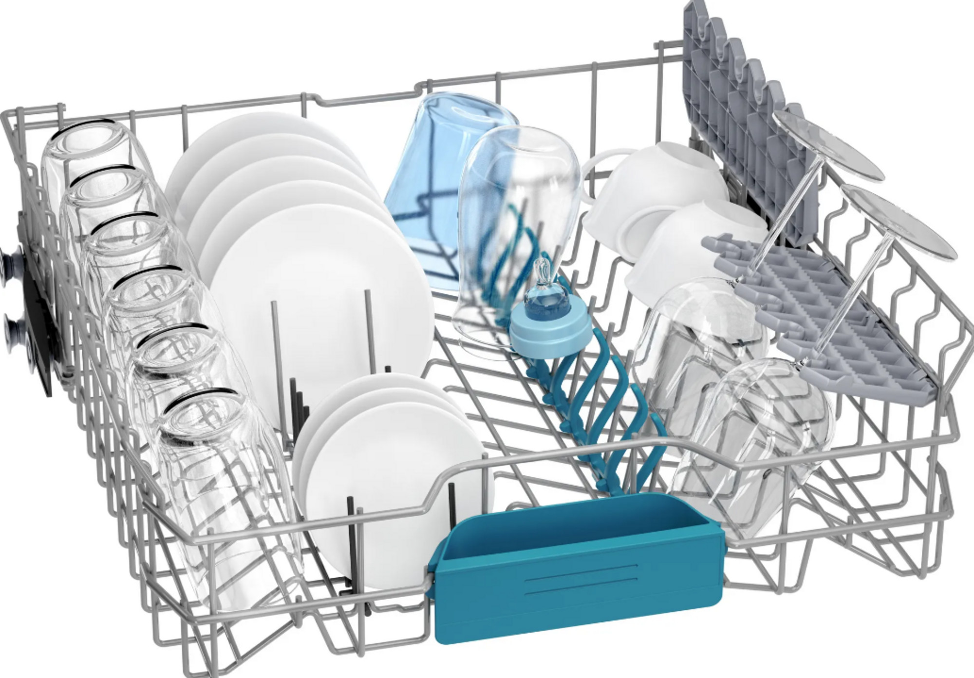 Esto es lo que llamamos una prestación de altura: tú eliges a qué nivel situar la cesta superior, en función de las necesidades de cada lavado. Por ejemplo, si tienes copas altas u ollas, puedes ganar espacio y altura adaptándolas con el sistema de regulación, que se ajustará a cualquiera de tus necesidades.