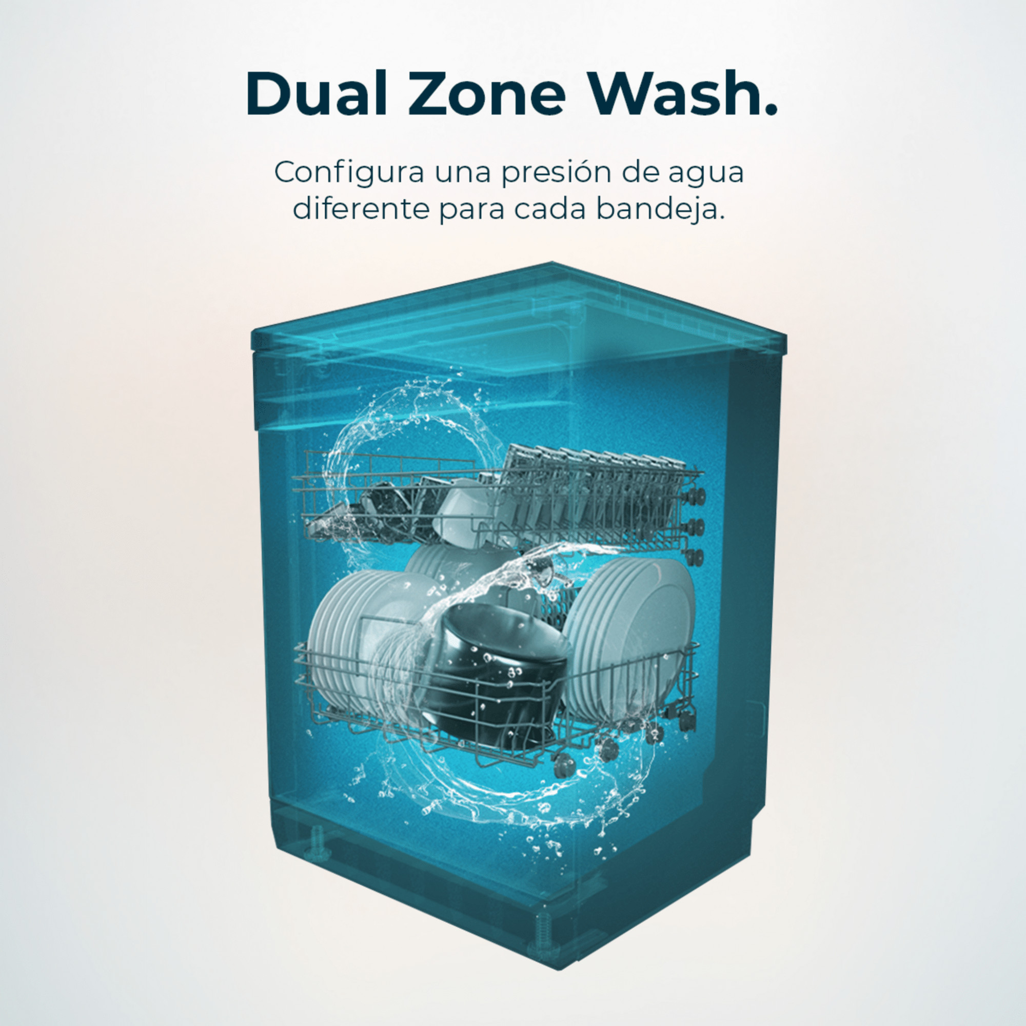 Adapta una presión de agua distinta en cada bandeja. Despreocúpate de separar la vajilla en distintos ciclos de lavado y lava a la vez ollas resistentes, copas delicadas, recipientes muy sucios, menos sucios…
