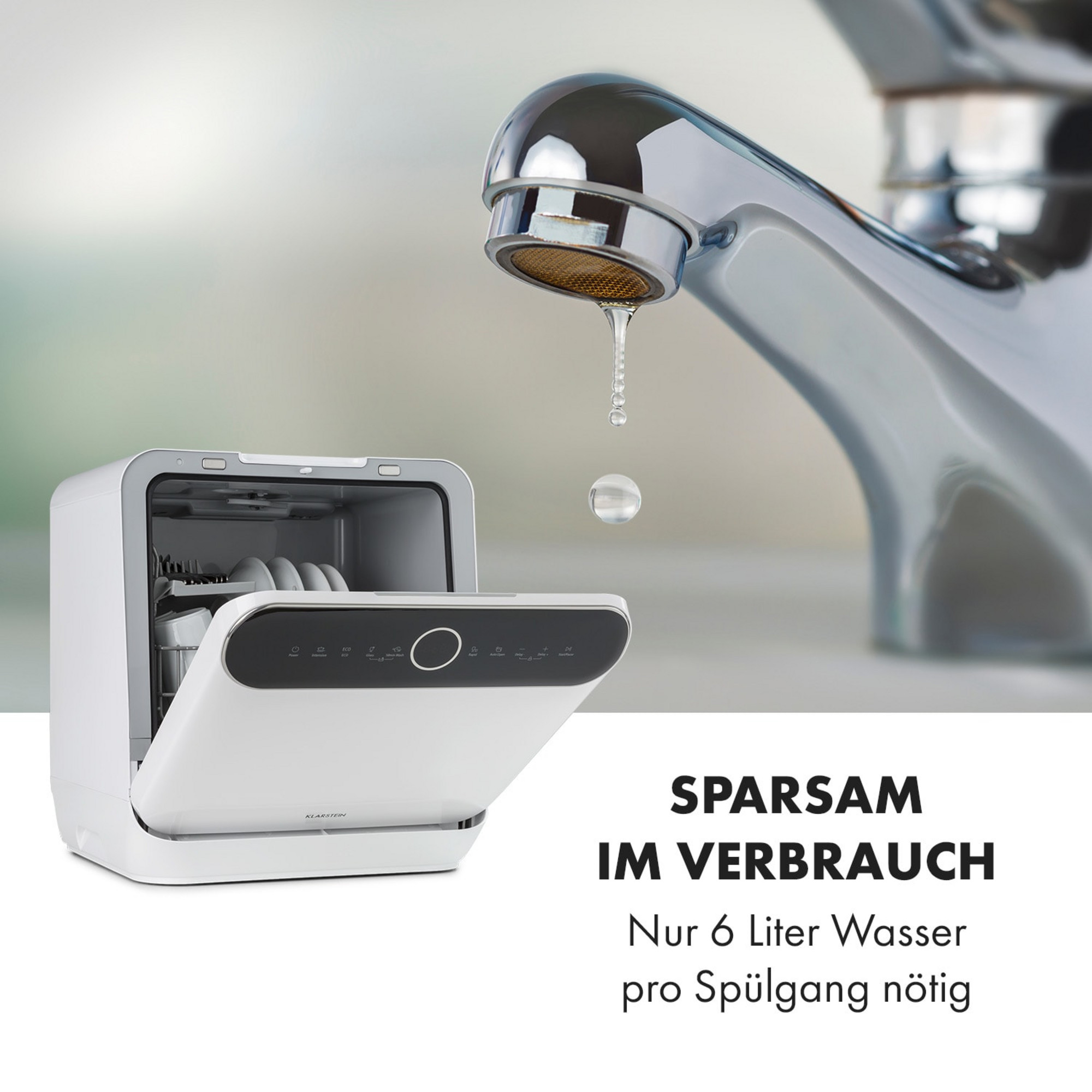El Klarstein Oceana Lavavajillas es el nuevo asistente para lavar la vajilla sin complicaciones en el piso más pequeño o en una caravana. Con 6 programas diferentes y sólo 6 litros de agua por ciclo de lavado, la Oceana se ocupa de todo tipo de suciedad. La opción de funcionamiento sin conexión de agua es especialmente atractiva si, por ejemplo, no se dispone de las correspondientes conexiones. Una característica especial es la apertura automática de la tapa frontal tras el proceso de lavado de la vajilla, de modo que el vapor de agua puede salir y la vajilla se seca con especial rapidez y queda directamente lista para el armario.
