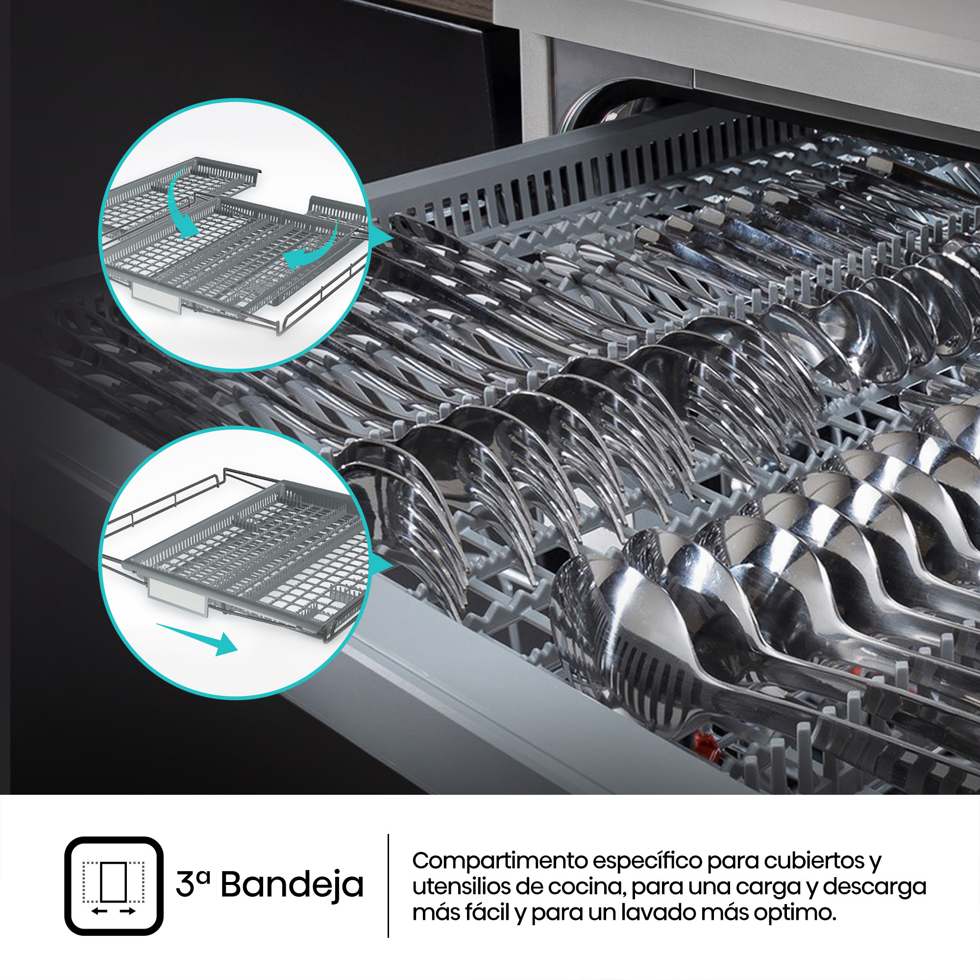 Esta cesta para cubiertos es completamente adaptable al interior del lavavajillas. Puedes utilizarla de manera flexible.