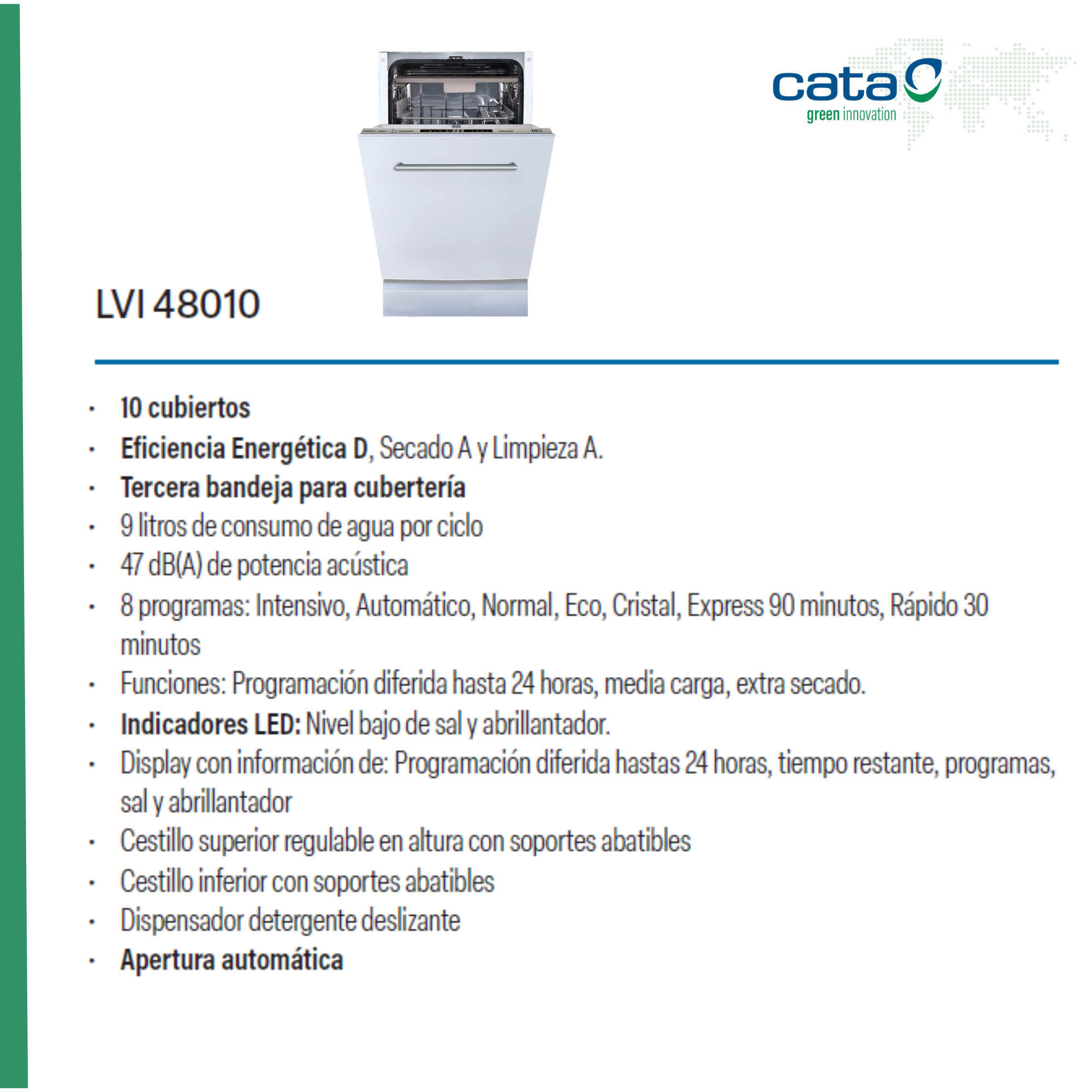 Lavavajillas integrable 45 cm – CATA LVI 48010, 10 servicios, 8 programas, 44,8 cm, Blanco