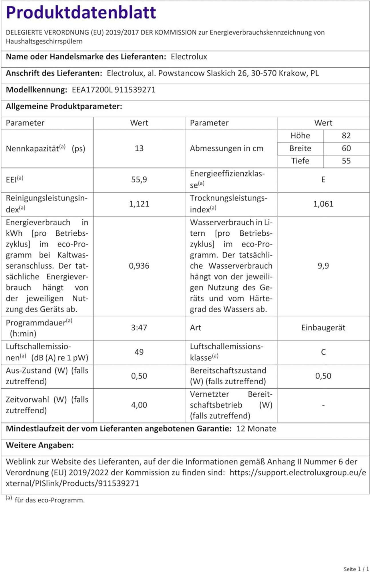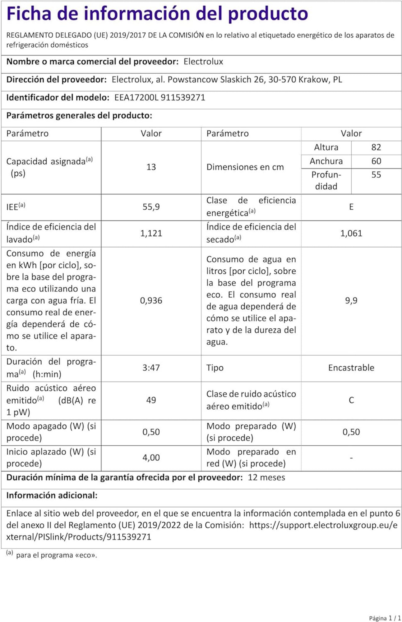 Electrolux EEA17200L. Ubicación del electrodoméstico: Totalmente integrado. Dimensiones del producto: Tamaño completo (60 cm). Color de la puerta: Blanco. Capacidad: 13 cubiertos. Clase de emisión de ruido: C. Nivel de ruido: 49 dB. Clase de eficiencia energética: E. Consumo de agua por ciclo: 9,9 l. Consumo de energía por 100 ciclos: 94 kWh. Ancho: 600 mm. Fondo: 550 mm. Alto: 820 mm. Mostrar detalles del producto de ELECTROLUX