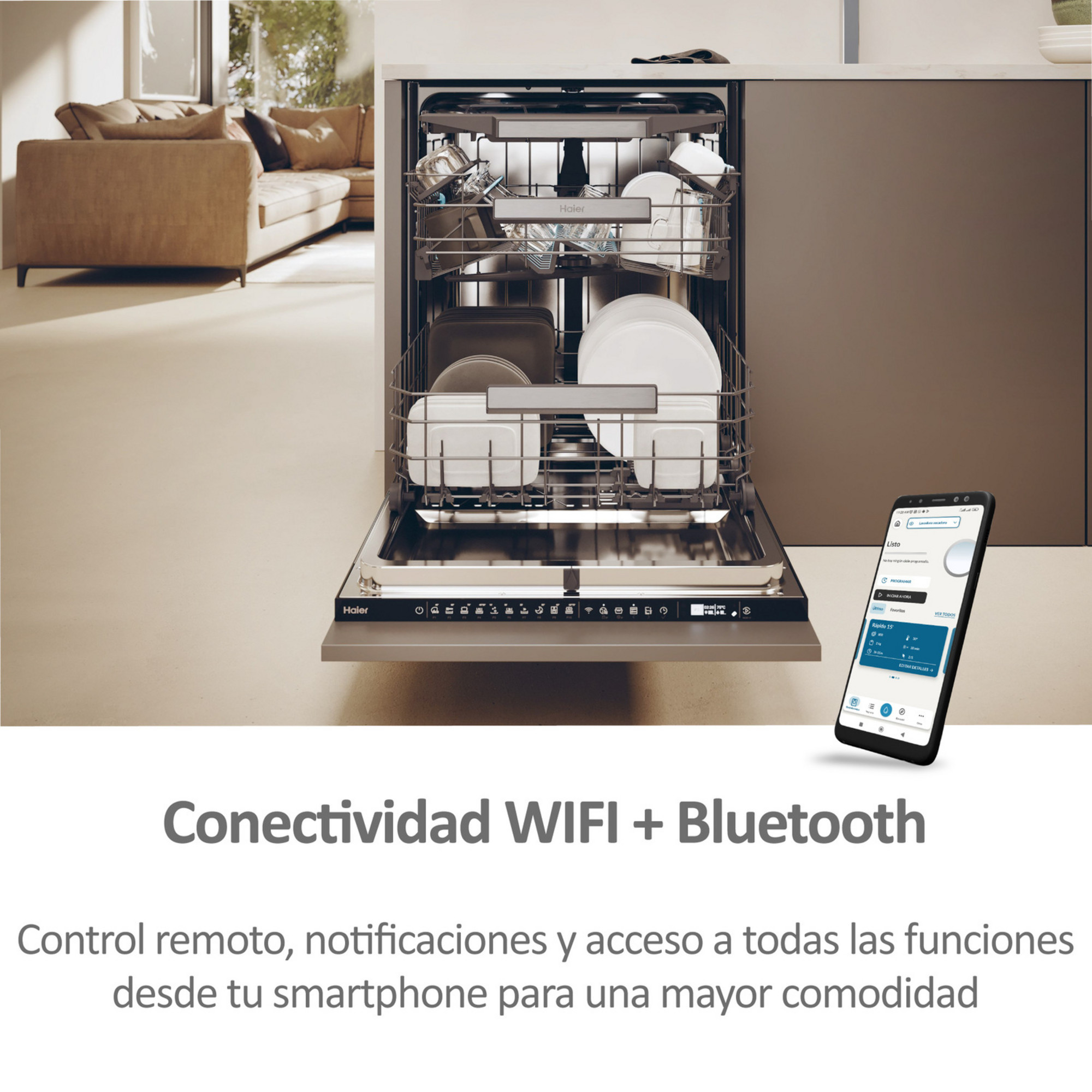 Gracias a su conectividad Wi-Fi y Bluetooth, puedes gestionar el lavavajillas desde cualquier lugar mediante la app hOn. Funciones como Shoot & Wash permiten optimizar la carga del lavavajillas tomando una foto del interior para sugerir el programa ideal.