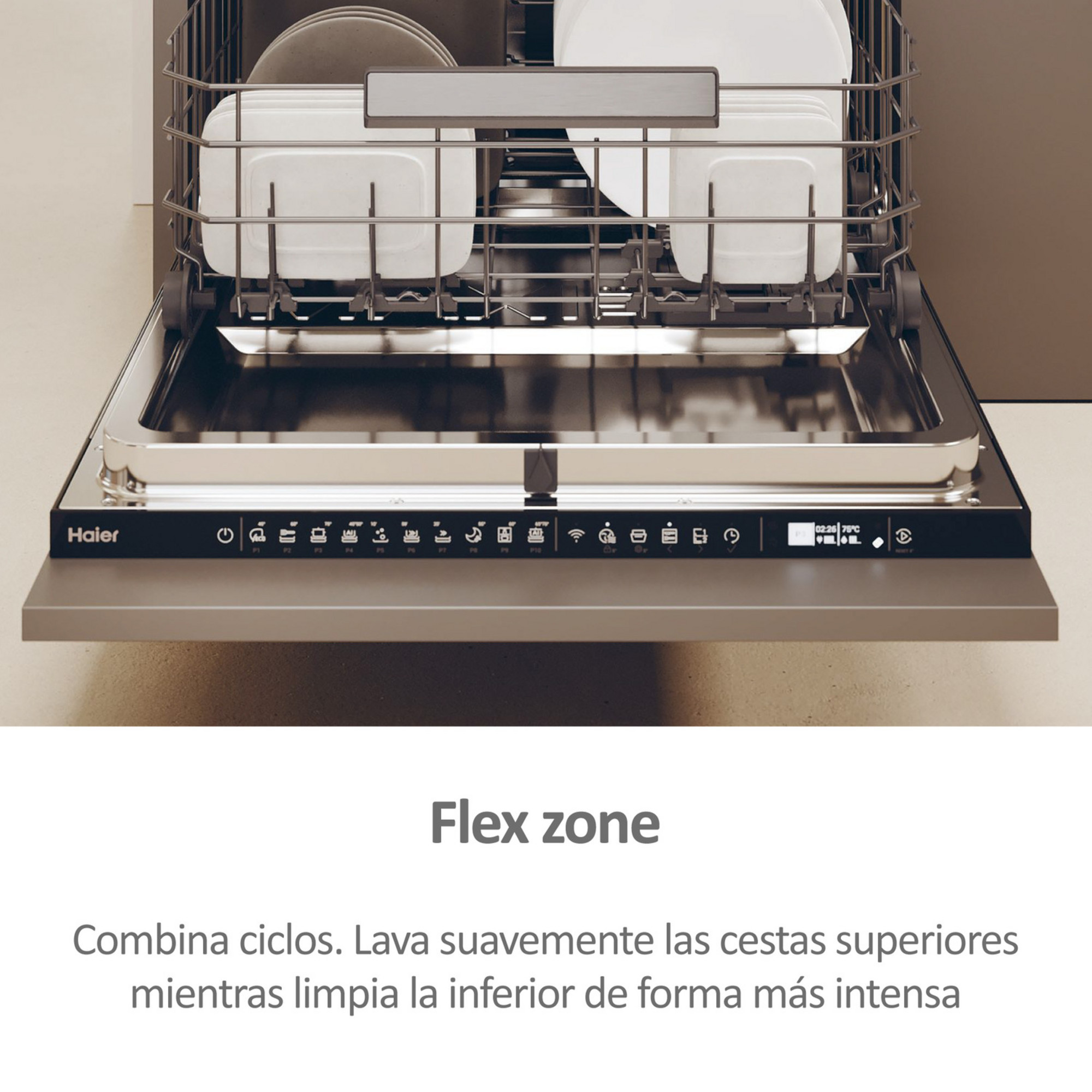 Programas Eco, Universal, Intensivo, Smart AI, Prelavado, 59 min, Rápido 20′, Noche, Flex Zone Wash, Smart AI Pro
