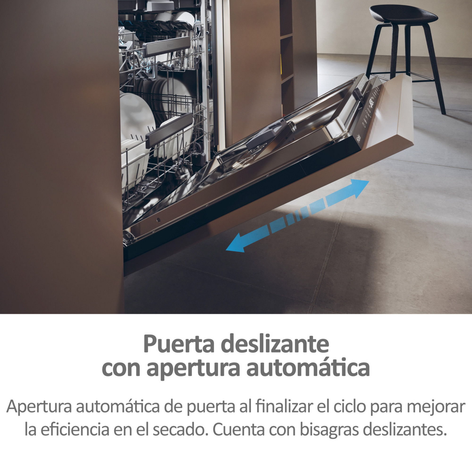 La función de apertura automática al finalizar el ciclo mejora el secado natural, reduciendo el consumo energético. Este innovador detalle se combina con bisagras deslizantes que facilitan la instalación en cualquier tipo de mueble.