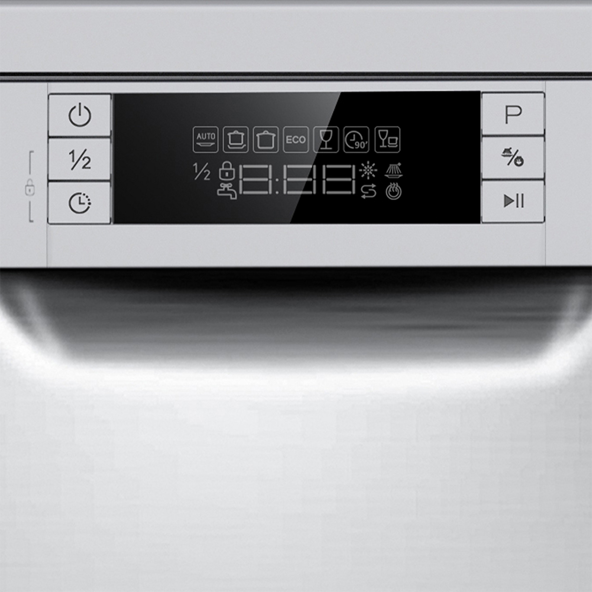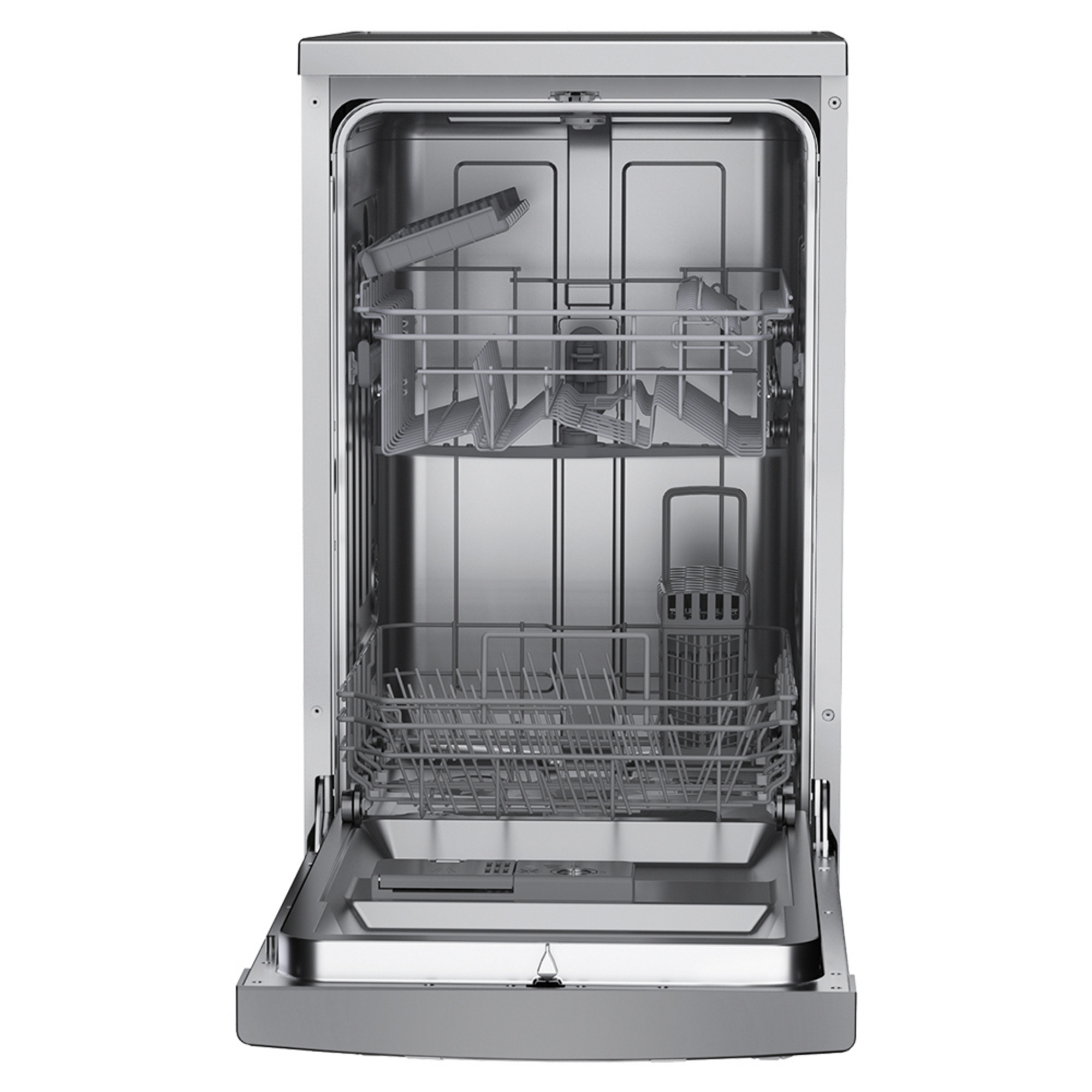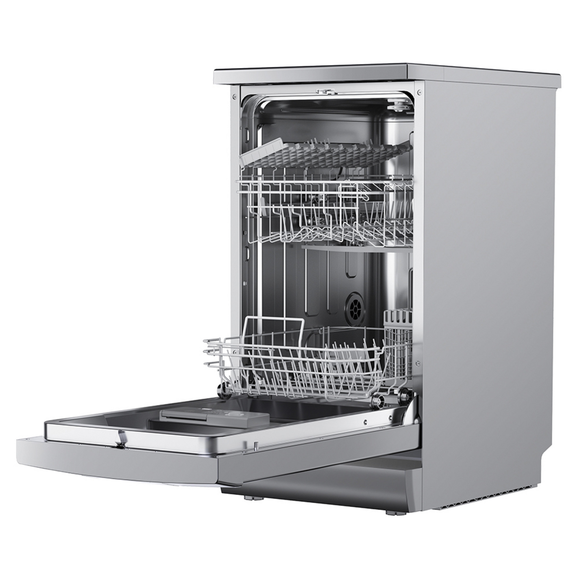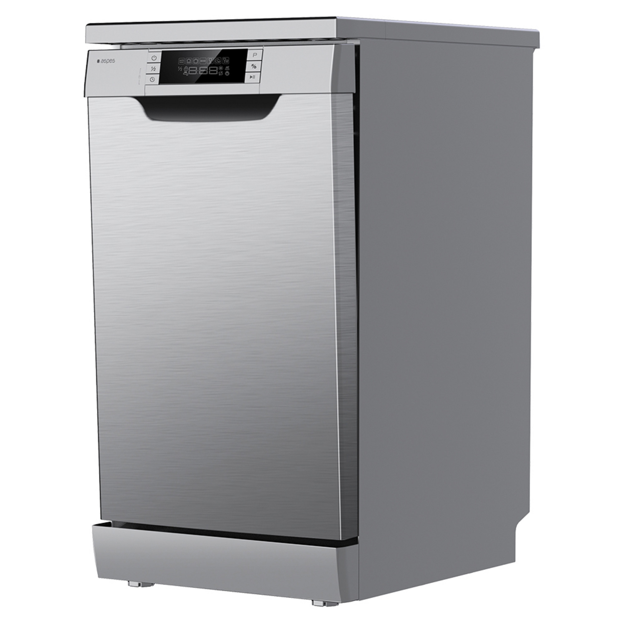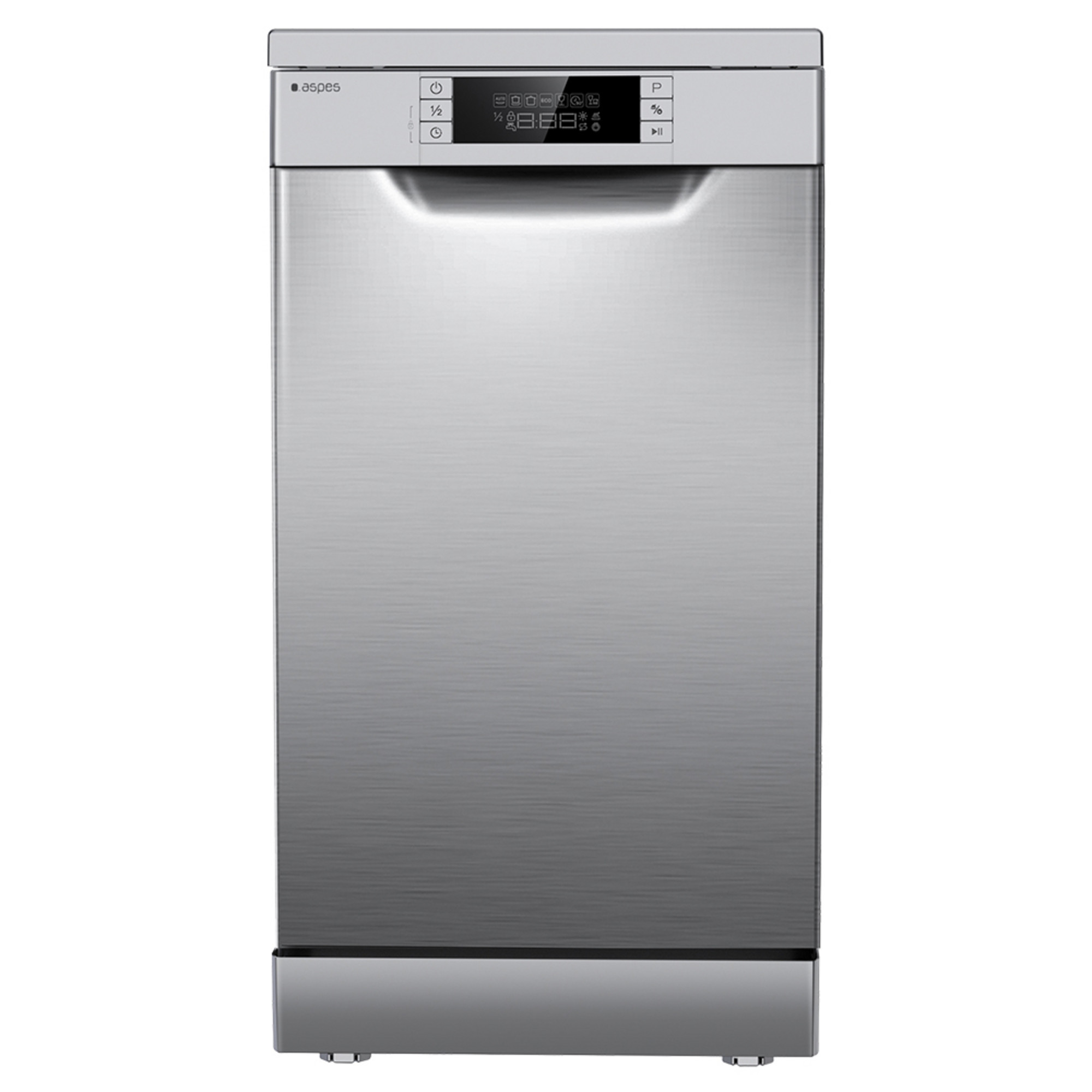 Lavavajillas libre instalación de 45 cm Aspes con eficiencia energética E, capacidad 9cubiertos, 2 bandejas, 7 programas, Media Carga, sistema de control Display LED Manual y estética Inox.