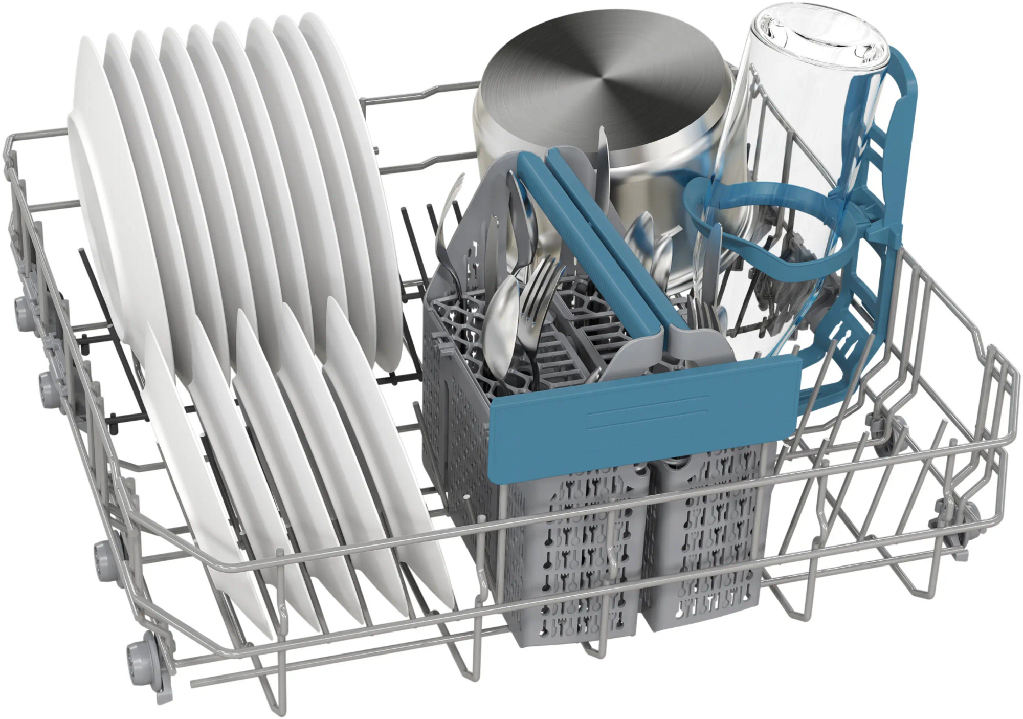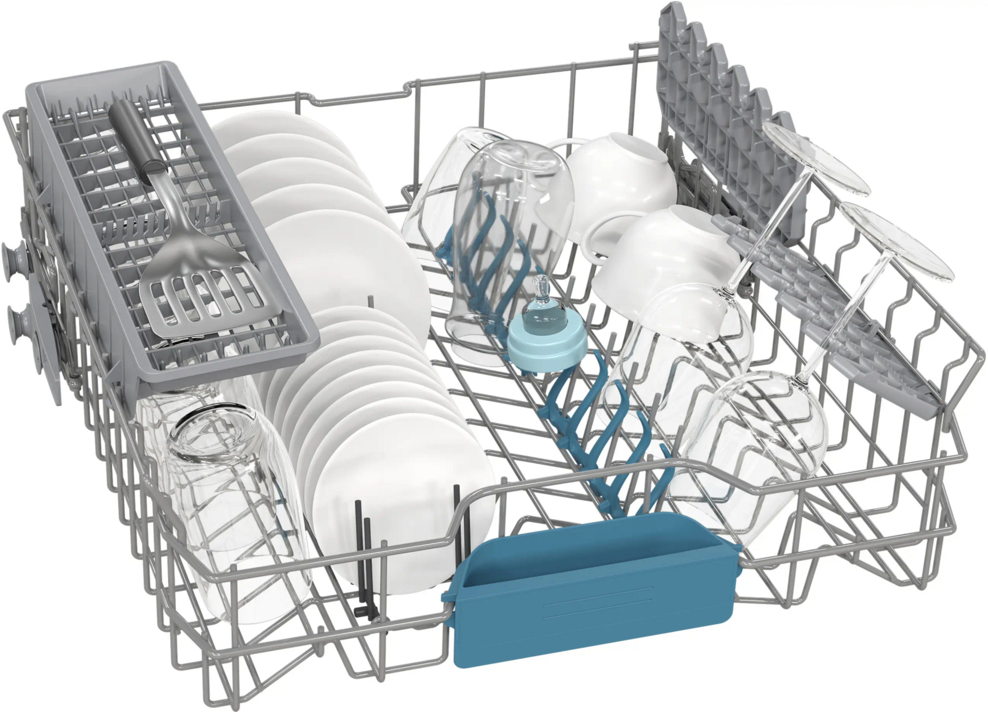 Organiza todo de forma práctica gracias a su capacidad de 13 cubiertos y a un interior pensado para adaptarse a tu ritmo. La cesta superior con RackMatic de 3 posiciones te permite ganar altura cuando metes ollas o copas, y el cestillo para cubiertos tipo dúo se puede dividir en dos unidades para repartir mejor el espacio. Además, incluye soporte para botellas y soportes para vajilla de plástico, para que no tengas que improvisar cuando lavas piezas voluminosas.