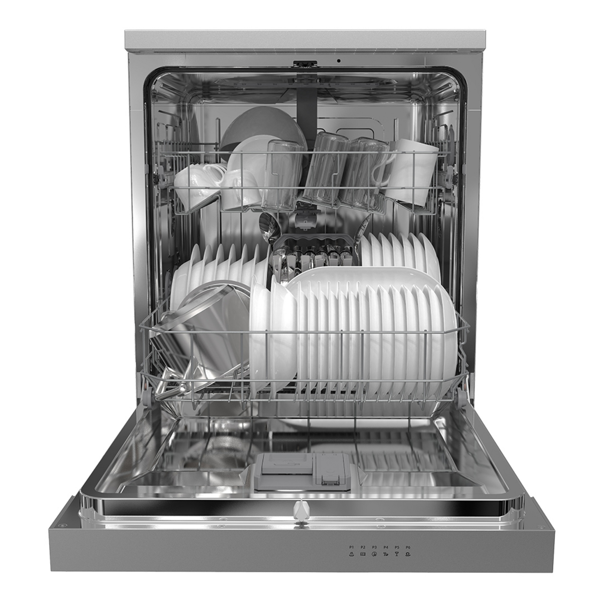 Estética inox con 2 bandejas y cesta de cubiertos. Sistema de control táctil con Display LED con 6 programas de lavado y funciones para garantizar el mejor resultado y cuidado de la vajilla.