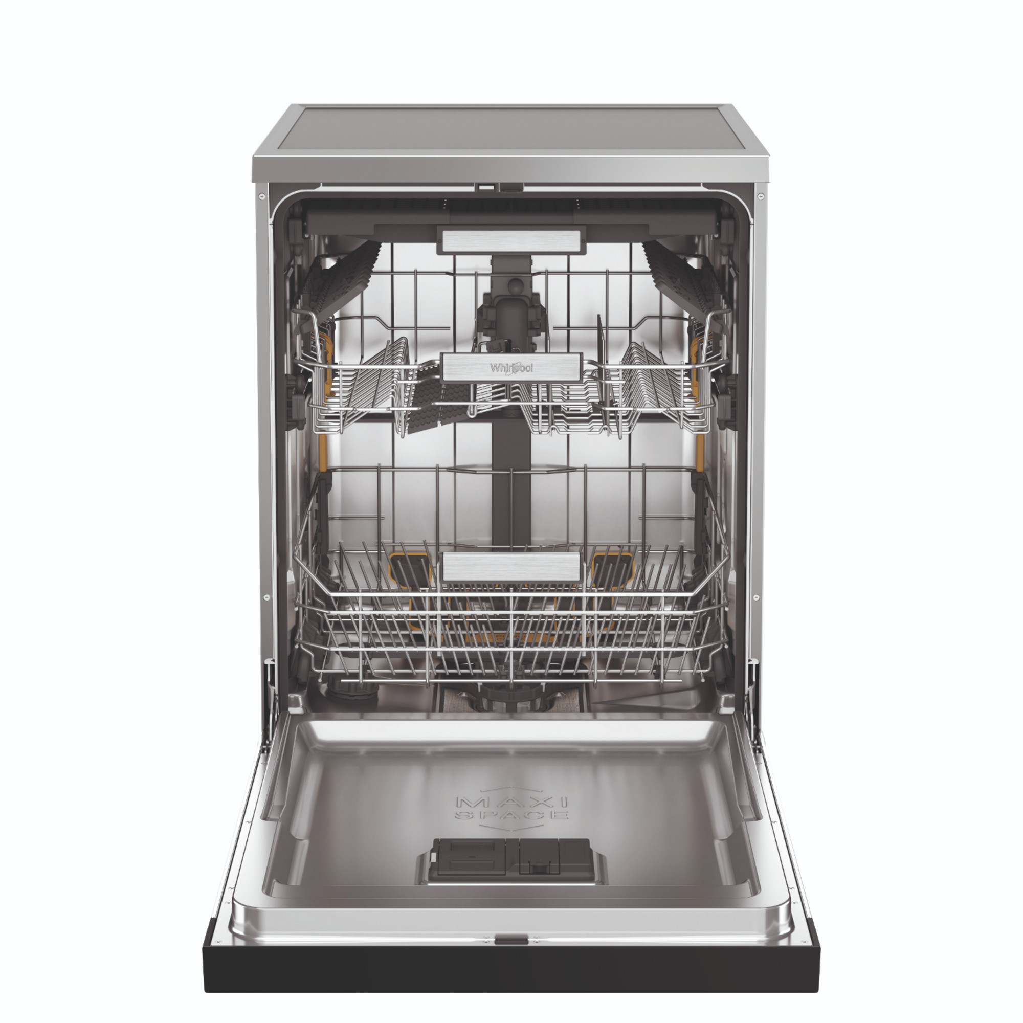 Whirlpool MaxiSpace W7F HS51 X. Tipo de instalación: Independiente, Talla del producto: Tamaño completo (60 cm), Color de la puerta: Acero inoxidable. Número de cubiertos: 15 cubiertos, Clase de emisión de ruido: B, Nivel de ruido: 41 dB. Clase de eficiencia de energía: B, Consumo de agua por ciclo de lavado: 9,5 L, Consumo de energía por 100 ciclos: 65 kWh. Ancho: 600 mm, Profundidad: 590 mm, Altura: 850 mm. Ancho del paquete: 625 mm, Profundidad del paquete: 675 mm, Altura del paquete: 880 mm