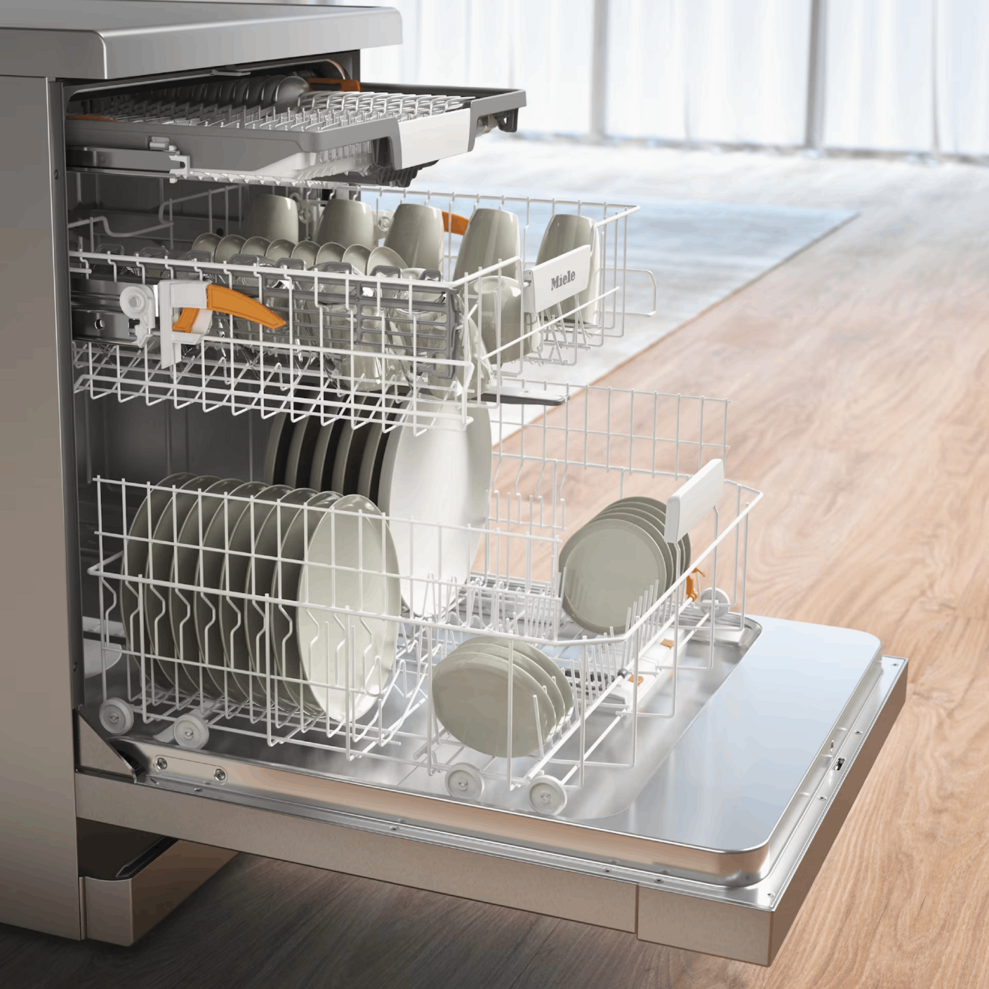 En el interior del Miele G 5811 SC Front Active Plus dispones de cestos bien estructurados que facilitan la colocación de platos, vasos, tazas y cubiertos. Elementos ajustables y partes abatibles te permiten adaptar la capacidad de carga cuando necesitas introducir ollas, bandejas o recipientes voluminosos. Esta organización flexible hace que la carga y la descarga resulten más rápidas, ayudándote a mantener una cocina despejada y eficiente en tu día a día.