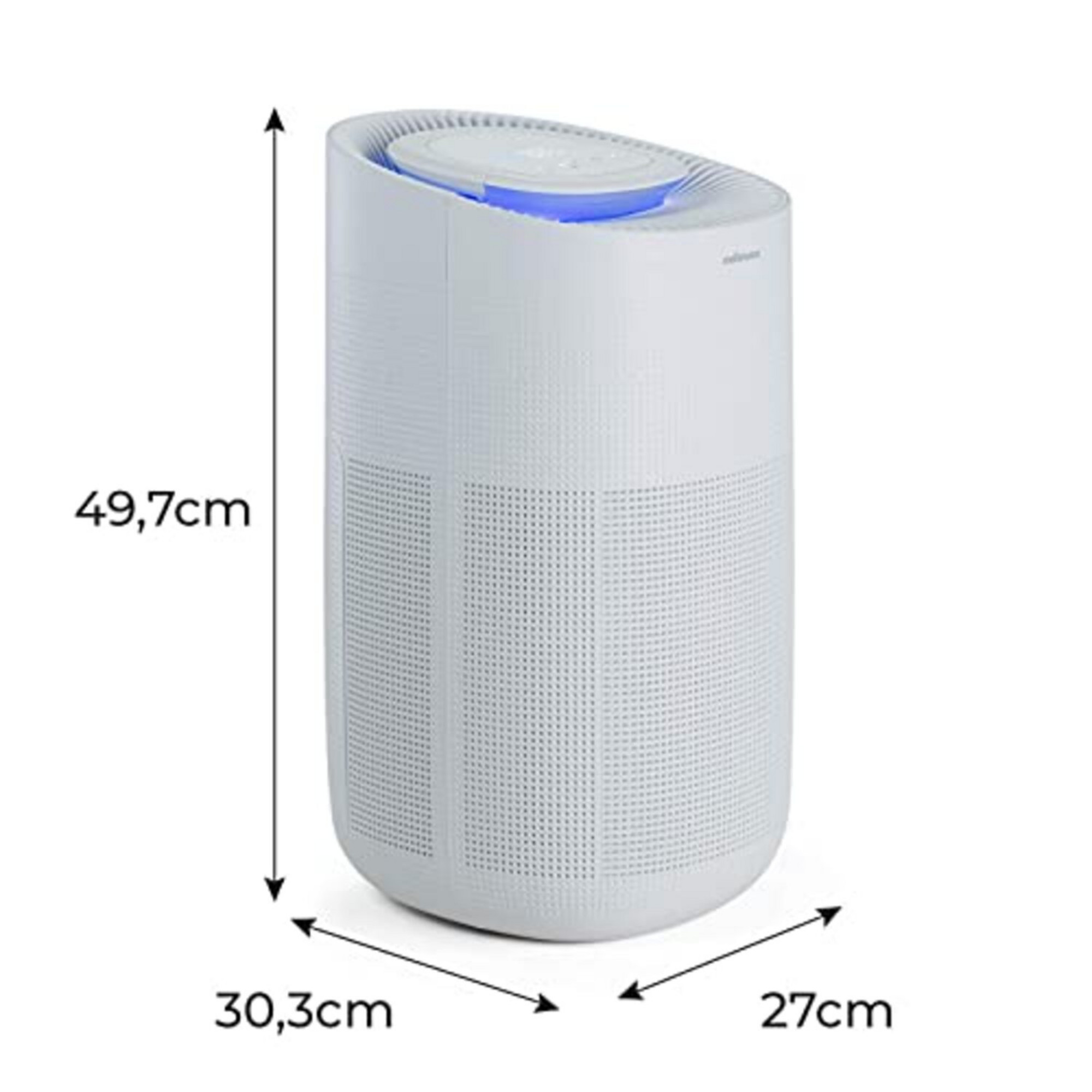 Funcionalidades 😍【MÁXIMA EFICACIA】 Purificador de aire Mellerware Freshly! con FILTRO HEPA 13 , en este purificador de aire se filtre mediante 3 niveles: pre-filtro (elimina las partículas contaminantes del aire), filtro de carbono activo (reduce olores y gases) y filtro HEPA13 (elimina el 99,97% de las partículas). Los diferentes niveles de filtración te protegen a ti y a los tuyos de diferentes agentes contaminantes. 💥【POTENCIA】 Para estancias hasta 50m2 , el purificador de aire con filtro HEPA 13 Mellerware Freshly! cuenta con un CADR de 400 m3/h (es la tasa de liberación de aire limpio del purificador) para filtrar y limpiar el aire con un rendimiento óptimo. La potencia del motor es de 50W, más que suficiente para un funcionamiento completo. 🔇【MÁXIMA SEGURIDAD】 Sensor PM2.5 , el purificador de aire Mellerware Freshly! dispone de un sensor para saber en todo momento el nivel de partículas en el aire, cuya calidad viene indicada por el color de su led: Azul (La calidad del aire es buena), Amarillo (La calidad del aire es mejorable), Rojo (La calidad del aire es mala). 🤖【TOTALMENTE PROGRAMABLE】 Puedes programarlo hasta 8 horas y cuenta con 3 velocidades, incluyendo el modo noche y el modo turbo. También cuenta con el modo automático, en el que adapta su velocidad en función de la calidad del aire. Dispone también de un bloqueo para niños y de un indicador de cambio de filtro. 🙌【DISEÑO ELEGANTE Y COMPACTO】 Purificador de aire con medidas compactas de 27 x 30,3 x 49,7 cm y un nivel de ruido reducido de Contenido de la caja 1x Purificador 1x Manual de instrucciones